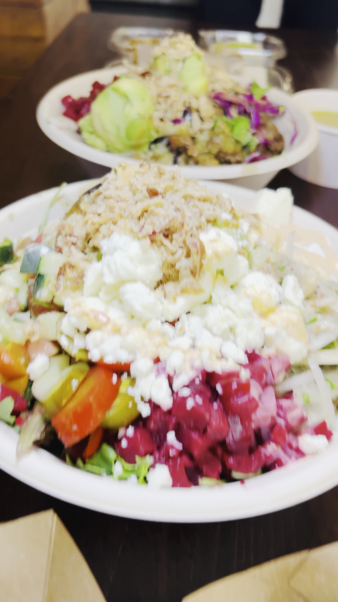 You have a choice between pita bread, wrap or bowl. Once you decide on your base you can start filling with proteins such as pomegranate chicken, falafel, or chicken/steak shawarma. Next comes your toppings! Examples include eggplant ragout, sumac cauliflower or onions, diced beets and avocado. Then get a squeeze of your sauce choice such as spicy tahini or balsamic vinaigrette. You really cannot go wrong! Their portions are so generous!