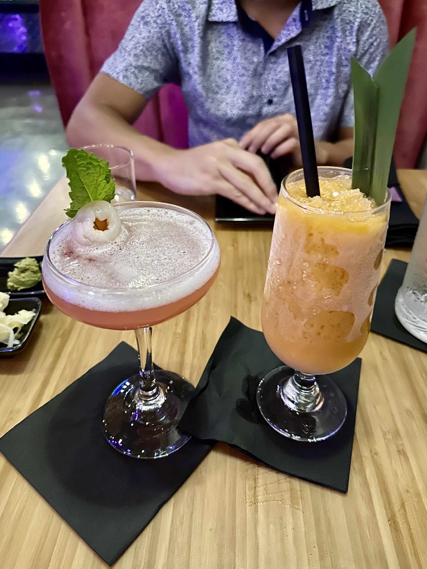 We got seated then our not-so-happy looking server came and awkwardly introduced himself and somewhat explained the menu. He made some suggestions, but we went ahead and order a Crispy Rice Sushi and cocktails (Eastern Medicine & Kyoto Muke) to start. When he came back later, we ordered a Bluefin Jalapano Handroll, Spicy Domo Roll, and a Golden Dragon.