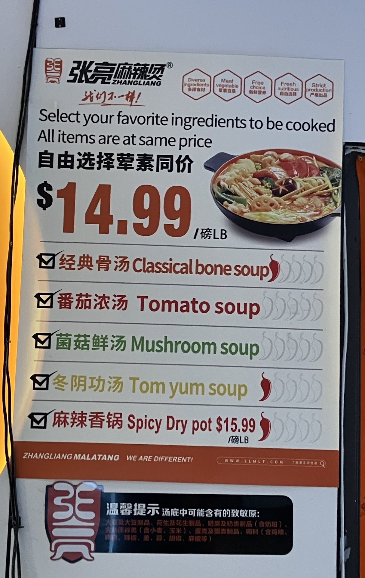 We've visited Zhang Liang twice. Some frozen items didn't cook well inside, unlike at YinTang. At Zhang Liang, you pay upfront with a mandatory 15% tip, while YinTang lets you pay with an optional tip after dining.