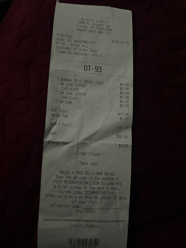Read moreGood afternoon everyone. Today is a brand new day for us all. But I have to thank God for blessing me the live to see a brand new day. And I'm able to tell you how my experience at Dairy Queen. I can't help myself on this one personally I have always love Dairy Queen ice cream especially the dipped in chocolate. Sometime I go and get a dipped in cone and ask them to see if they can dip it at least two times. But at this time I was in the drive thru I had all those special and our Special came with the dipped in chocolate bar. They keep it in the freezer that was my first time trying this one out it was just as good as the dipped in cone. If I was a school teacher and I had to grade I will give this one A+. What made it even so right at at the drive-thru the young man was so polite he listen to me he read my all the back to me and did everything on point. The customer service was excellent. The quality of the food was spectacular. The temperature of the food was terrific. This made my second time visiting this Dairy Queen so I want to make sure that this is the right one that I am trying to let the public know I know it is in Irving just before you get to the mall I know it's on the service road. I apologize I'm not too familiar this was my second visit. If you one of many people on this Earth and you love chocolate the way I do sometime please try a dipped in cone and you cannot go wrong from Dairy Queen please and let me know. To all the hard workers that has satisfy meaning thank you from the bottom of my heart. Thank you for the excellent customer service and may God continue on blessing this company. And may your day be blessed and also be safe I will return with some more chocolate lovers like me...