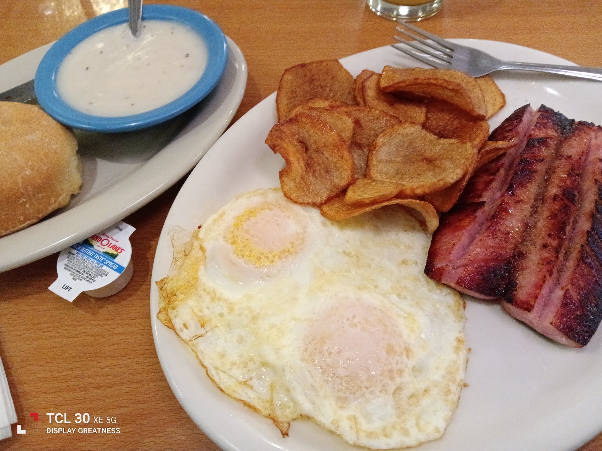 Just visiting family wanted pancakes I got the pancakes with four fried eggs home fries and turkey bacon unfortunately the eggs were fried over medium supposedly where they were supposed to be, and the turkey bacon was pretty much just seared it wasn't even fried it wasn't crispy at all.