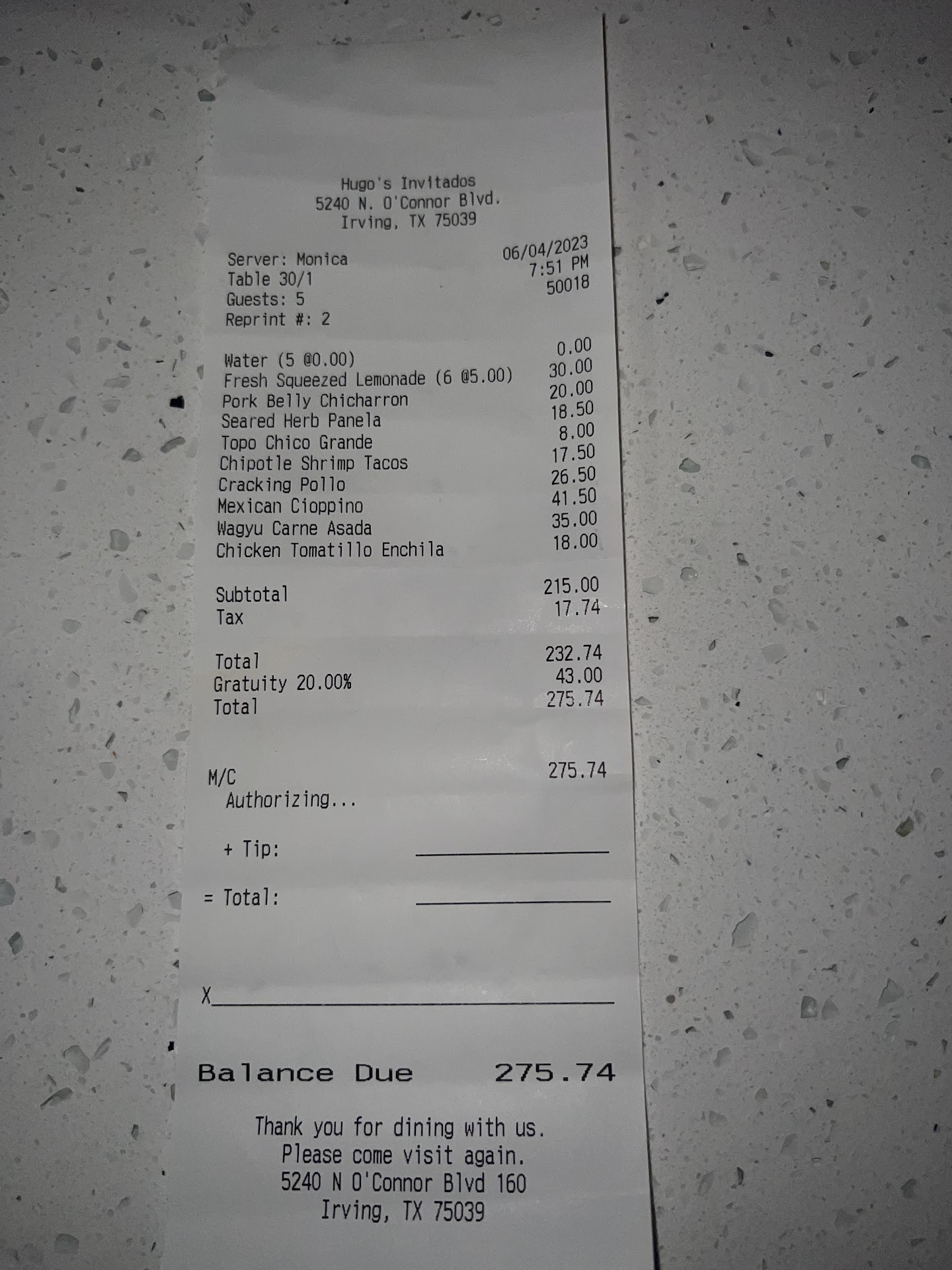 Read more6/4/2023 I will start by saying that my family comes to Hugoâs regularly. Weâve recommended it to people and come any chance we get, but today we were very disappointed. Our server was Monica, and from the start there was an attitude from her for anything asked. For example the fish on one of the dishes my father regularly orders has changed and she did not come by with enough time to send it back and did not care to address our concern when asked. She walked by and did not give us a second look. We had to ask other waiters for refills/extra utensils/etc. Needless to say we wanted to get the check and get out as soon as possible but when the check came we were caught off guard. I will start by saying money is not a problem, for good food and service we know we are going to pay, weâre a family of 5 but the gratuity was already added to our check, 43$. Never was this done before. Generally itâs for groups of 6 or larger but even if itâs now a rule for tabs over a certain amount spent we were not even given the courtesy of letting us know. And we checked, nowhere on the menu does it specify the conditions for added gratuity. Had our service been different we wouldâve even tipped on top of the included gratuity, weâve all worked/work in the service industry we understand but our treatment today did not justify this. Overall weâre disappointed with the decline in service and treatment of customers and will seriously consider going back. And we think people should as well, the food for the most part is good, but youâll be treated with much more respect...