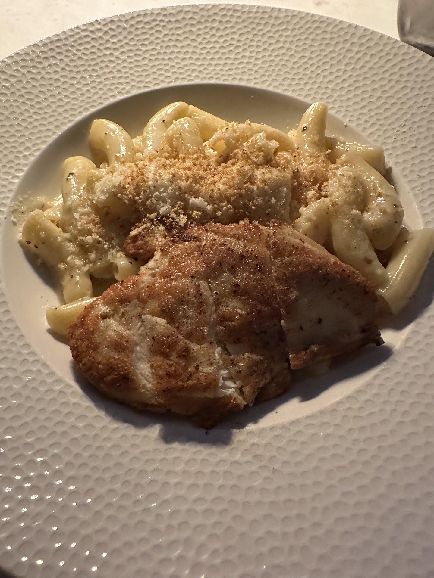 The food, too, was truly amazing. We had the Clams Oreganata to start, my girlfriend had the Whole Roasted Branzino, and I ordered the Goat Cheese Mezzaluna. David and the team were sensitive to my medical dietary restrictions, specifically blood orange which they use in many of their dishes one way or another. They were able to remove/replace the blood orange in nearly every dish without issue. The only dish they couldn't was the Mezzaluna. I was looking forward to that dish very much and was disappointed I couldn't have it, but David recommended the Chicken Scarpariello instead, and I was VERY pleasantly surprised. The chicken was very moist, and a much larger portion of food than I expected! I had plenty left over to take home and eat for lunch the next day!