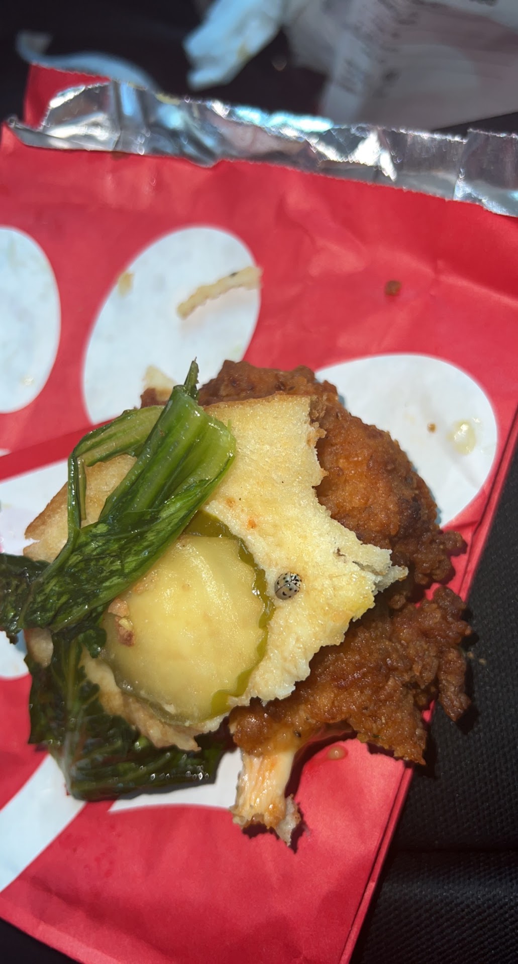 Ive been coming to this chick fil several times since i work 5 minutes from there. During lunch time its always crazy packed and drive thru takes long so I usually order on the app and pick up carryout. Yesterday during my lunch around 1:00 pm I got there and there was an empty parking stop at the front so i go ahead and parked there and wait for the notification when my food was ready. No more than 2 minutes go by and a employee comes up to me saying I could not park there. Keep in mind there was no sign nor cone saying otherwise. He said that parking was for drive thru ( for cars from drive thru to wait for their food if needed). I told him I was waiting for my food for carryout and he said I still needed to move. I didn’t made it a big deal so i just moved and had to park next door at Taco bell , since chick fil doesnt have enough parking for customers. I then go inside to pick up my food and I drive to my job to eat there. I ordered the spicy deluxe meal & Im literally a few bites done eating my sandwich when I notice a bug stuck to the bun on the inside of the sandwich. It kinda looks like a grayish colored ladybug. I immediately stopped eating & I didn’t had time to go back to chick fil a to show them cause I had like 5 minutes left from my lunch. I already complained through the app & they are supposed to call me within 1-2 days . Im glad I saw the bug before eating it or how knows If i ate some without knowing .They should be more careful when...