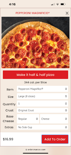I had been seeing commercials for a long time (years) and I finally found a location in Irving. I went online and placed my order. I chose curbside from the option on the website and input my vehicle info. I drive to the store and clicked “I’m here” waited and waited and waited finally going into the store to be told my pizza had been ready for all of that time but they don’t do that anymore. I was handed a cold, old pizza and told it was my problem. I went home and tried to contact Marcos and that is almost impossible. The receipt has my name, number, curbside and the vehicle description. They could have at minimum called the number to inform me that isn’t an option although it was definitely an option Marcos website gave me and Dominos still offers it so I had no idea it was a “COVID” thing like the counter help informed me. Bad service makes your food taste bad even if it was hot and fresh. Sadly it was NOT. First time and possibly the last since it’s my fault they offer a service they don’t fulfill. I am getting nowhere with the store and this store is not on the map to choose address to complain higher 4070 N Belt Line Rd, Irving, TX 75038 How to I get anywhere when it’s not on the drop down location? Fed up. Hazmom at att dot com you look me up and contact me. *mad...