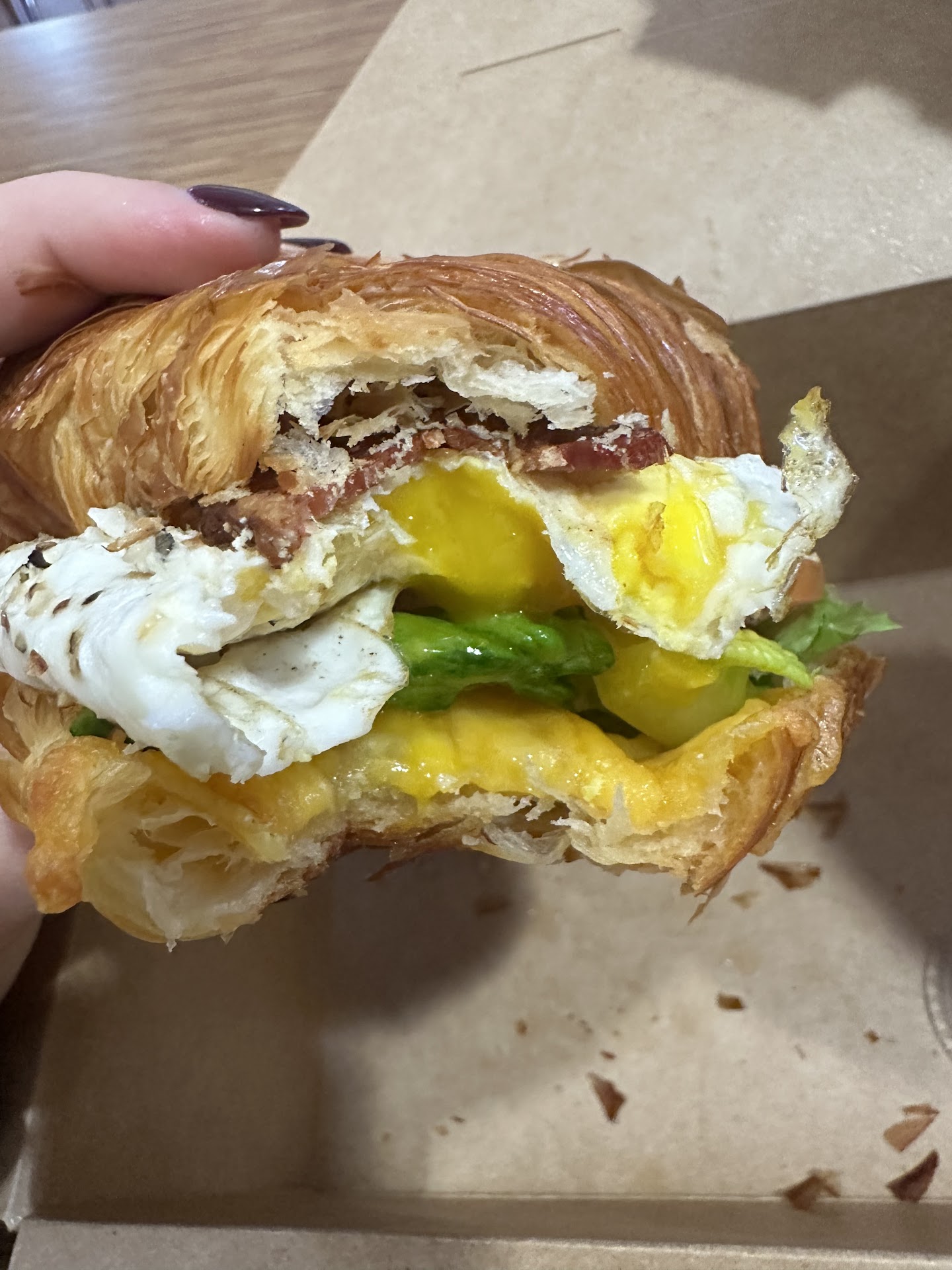 I ordered a breakfast croissant (bacon, lettuce, tomato, cheese and egg however you want - I chose fried with a jammy yolk). Perfectly seasoned and cooked egg, crisp ripe veggies, thick bacon, and a flaky, hot croissant with toasted cheese.