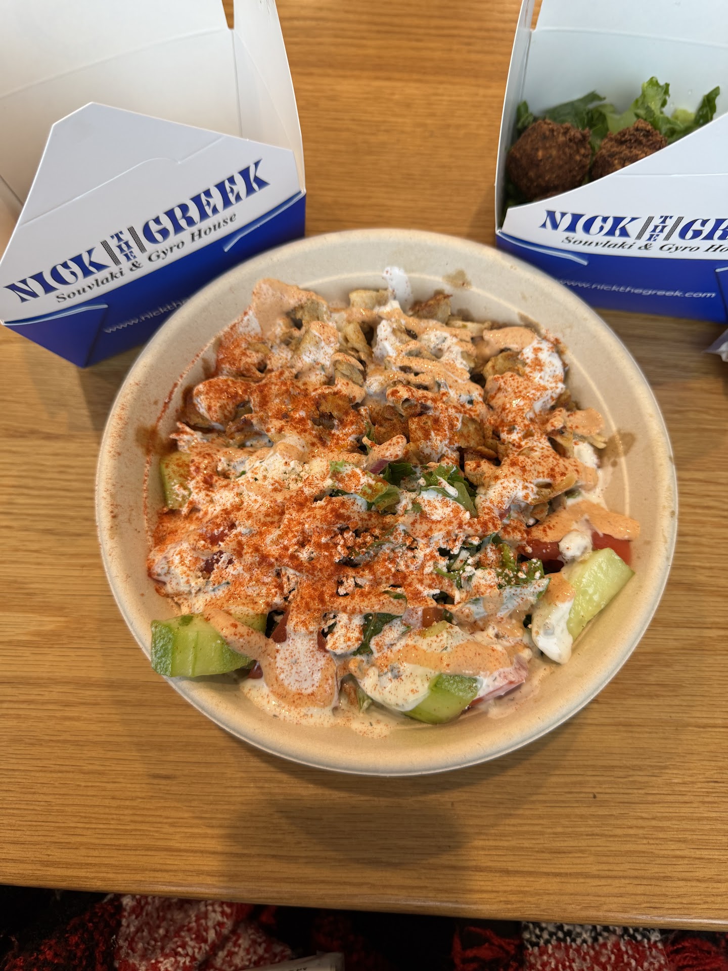 I visited Nick the Greek for the first time and dined on a colddddddddd day! Kristina, the assistant manager, was there and recommended I try the gyro bowl. I got the gyro bowl with chicken and pita bread. I asked about some of the protein options and what they were. I received nothing but help. I tried the falafel, which was different but still pretty tasty. The gyro bowl was so good and soooo filling!! I had three sauces to try- a spicy sauce, tzatziki, and a (honey?) mustard. They were good with the falafel, and the spicy sauce on the gyro bowl took it to another level! I have dined at C-A-V-A before and always get the chicken and rice bowl. For about the same price and similar ingredients, you get more at Nick. I ate slightly less than half a bowl at Nick’s and I never have leftovers at C-A-V-A, although I do get full. This is not a diss because C-A-V-A is still good, but for the money I’d rather buy a bowl from here. I also had two beverages and a dessert. My favorite drink was the mandarin cardamom, and I also tried a Greek drink, Loux, sour cherry juice. It tastes very good and was great for sipping. Lastly, the baklava was so good with the chocolate drizzle and the honey! All in all, I rate 5 stars and will absolutely come back!! Kristina was the best, super kind and helpful, and give...