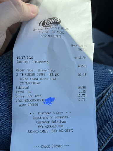 My girlfriendās order is a masterpiece of simplicity: chicken fingers, fries, and extra toast, with an unreasonable amount of Caneās sauce. She takes one bite, and suddenly, all her problems disappear. As for me, I just sit there, marveling at the power this place holds over her soul.