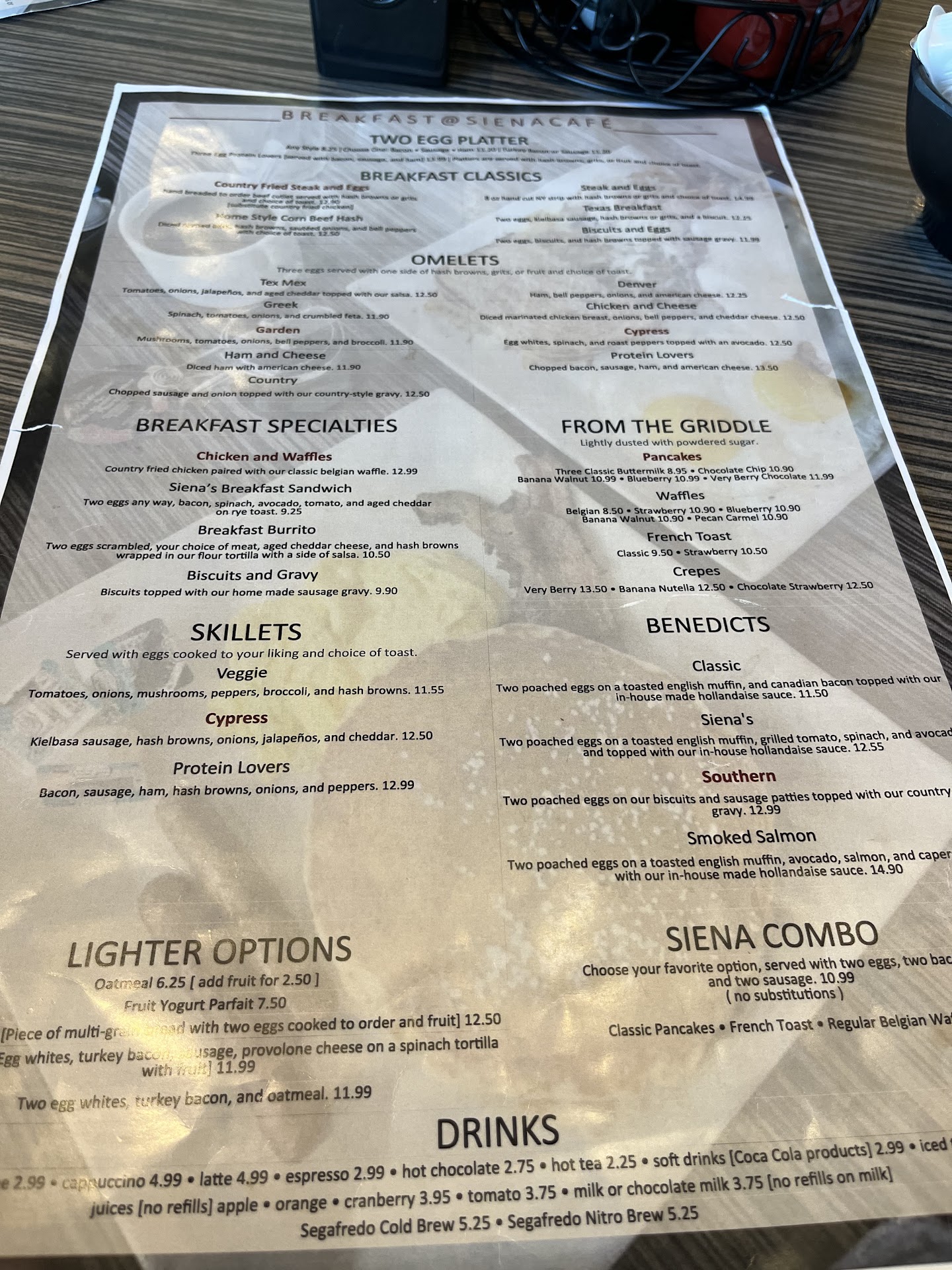Update 10/31/2021 Non-menu specials at Siena Cafe. Strawberry cheesecake French toast (not too sweet) and Chicken Bennys (pictured with scrambled not poached, but so good either way!) The two custom sauces on the french toast are so good you wont need syrup! Tastes light and fresh! The chicken bennies have a biscuit half topped with eggs, the best fried chicken breast you'll ever eat, and cream gravy! Totally awesome food!