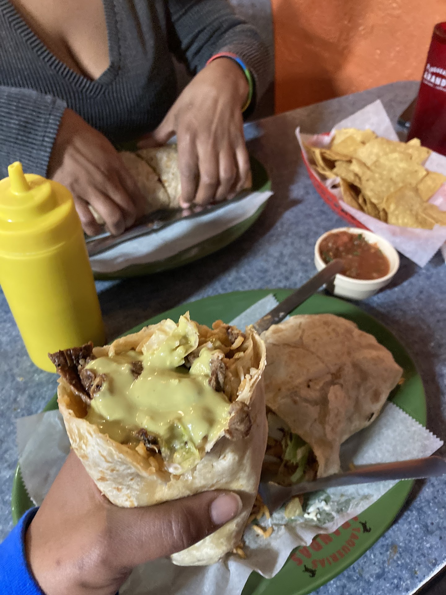 She brought us some chips and salsa, which was good, not spicy for all my non spicy lovers. And a bottle of green salsa that is spicy, so beware!