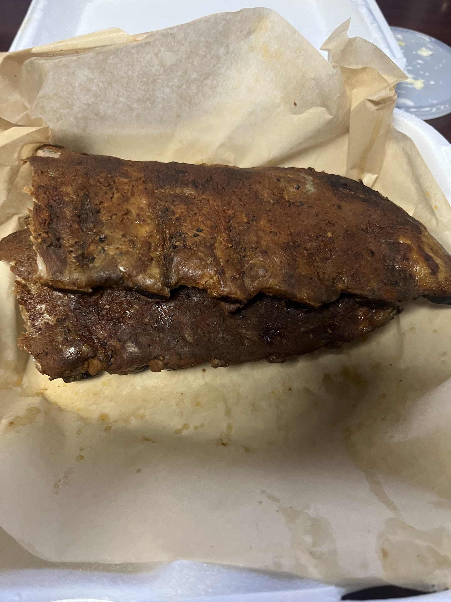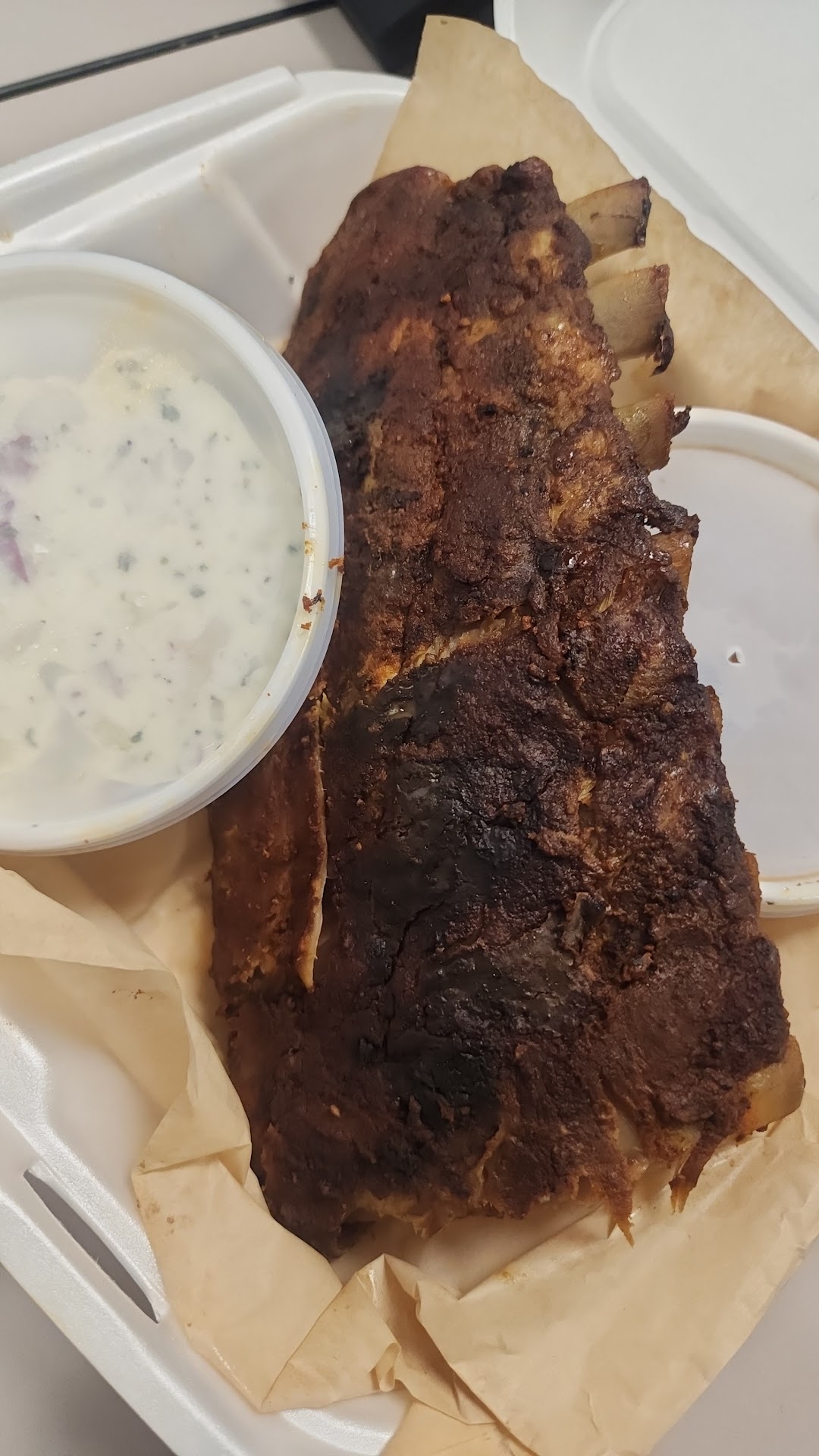 Been craving some good ribs lately unless I want to go to famous Dave's in rancho which is kind of a drive I wanted something local and wanted to see if it was worth it so I put in a mobile order and the customer service was great friendly and efficient except for the part where a server had a massive PINK-EYE infection in both eyes and the price it was good off the bat compared to other places, the sides were 50/50 their cole slaw was good they're Mac and cheese bland as fak! Now the main thing the ribs had a good rub weren't burnt however there was NO SAUCE! I mean for a bbq ribs you'd think they're be some bbq sauce so for that I couldn't give a accurate taste comment. for the ribs giving this establishment two stars for the error they made which is a simple fix and give their Mac and cheese more taste giving them an opportunity to improve...