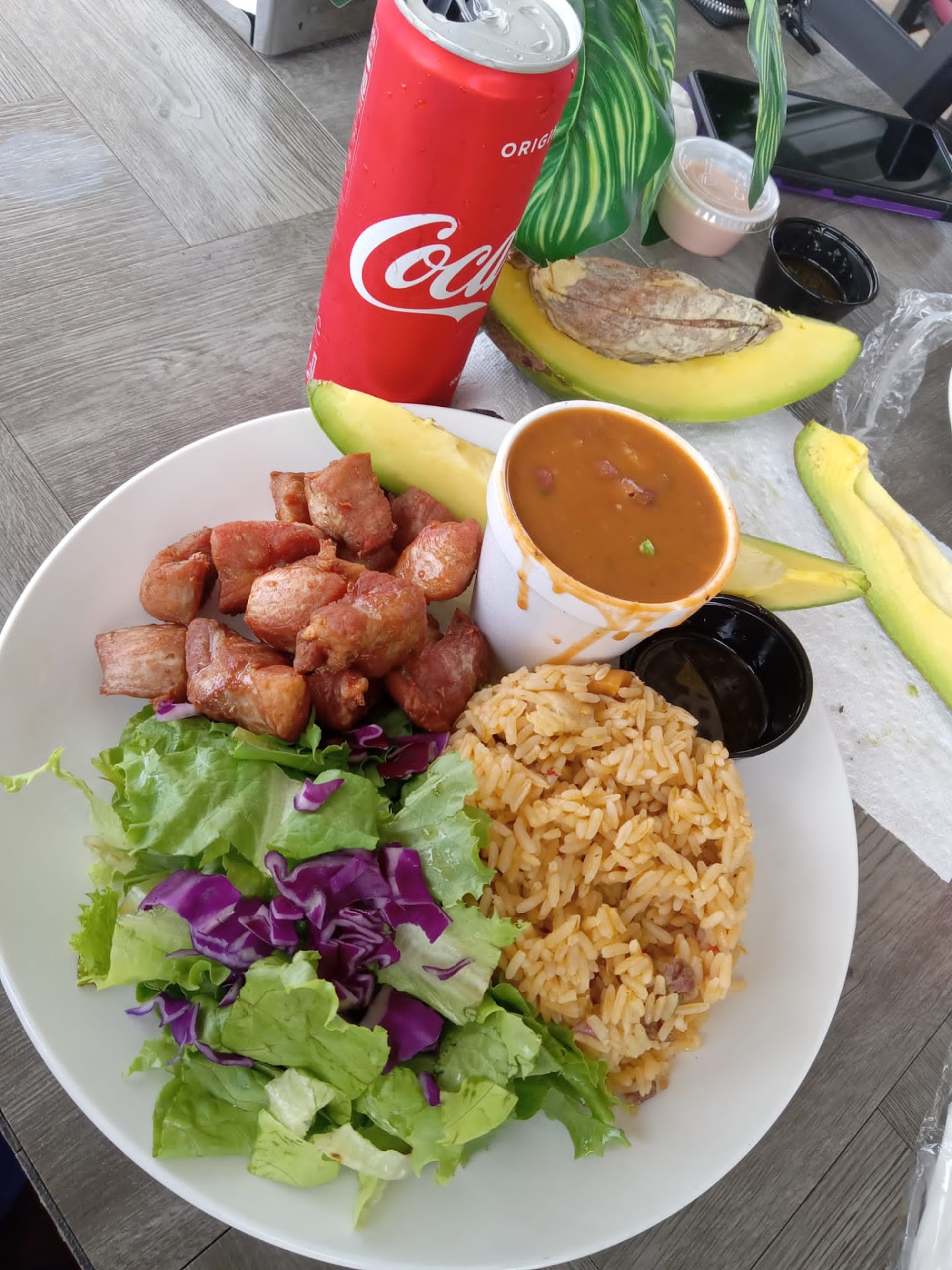 Incredible food! It's set back off the main road just a bit ... right before the paintball area. Clean & quaint. Family run business. The food was delicious. We had Carne guisado with beans, rice & tostones. $23 for 2 full plates of food, 2 bottles of water and a natural juice. (Which was also great) They make their own hot sauce too! They are out of this world! I will definitely stop by again before I leave to buy...