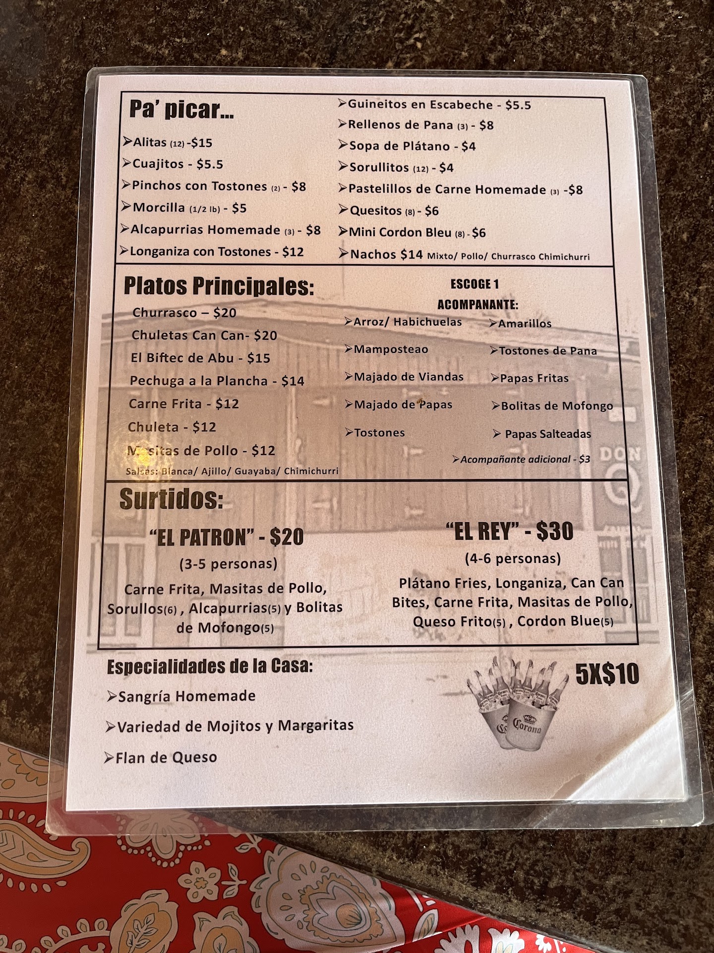 Read moreMonday wings (alitas) special is a good deal. 5x$10 corona or michelob buckets good deal also. The pork or chicken skewers (pinchos) are also good with tostones. If the restaurant is full or busy, parking could be a little challenging, but usually you can find parking out front or on the side. No a/c, the restaurant is like a terrace, If you sit in the chairs in the gravel area, you may sink...
