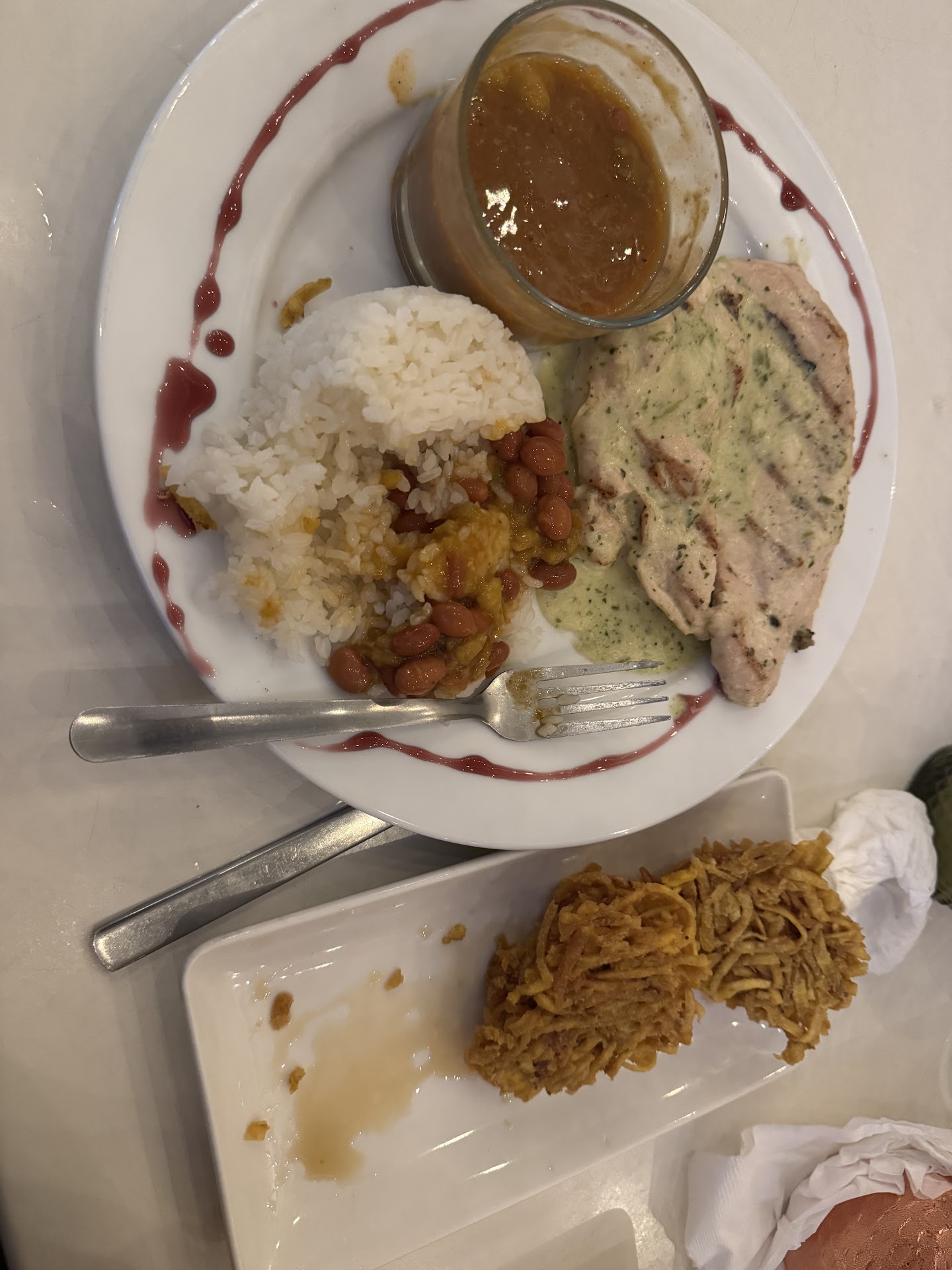 Read moreGreat, convenient parking across the street. There's a chain across the doorway where you have to wait to be seated.I thought it would be a very upscale restaurant. They just didn't want anyone using their bathrooms. The menu was wrinkled, unorganized, stained, and some pages were laminated, some were not. Many tables are right next to the beach and have an enjoyable view. The server was very nice and brought our drinks quickly. The Mojito Flight was beautiful but the regular and mango were very strong with seltzer and hard to drink. The passion fruit and strawberry (fruit of the day) were well made. The appetizer came quickly but we had to wait so long for our meal, we thought the server forgot to put it in and were ready to leave. The shrimp needed to be deveined. This was a Tuesday, early afternoon. They weren't busy at all until after we received our appetizer. We got the fish sampler appetizer. I missed taking a picture of that part of the menu. Even then there were only a handful of tables. We asked for the check and our mahi mahi tacos to go. The carry out was packed well with everything in a different container. Fish was not breaded, tacos were on corn tortillas (which it says on the menu). Weird choice. Easy to reheat later. Flavors weren't good enough to hold up to not being breaded and on flour tortillas. Paid about...