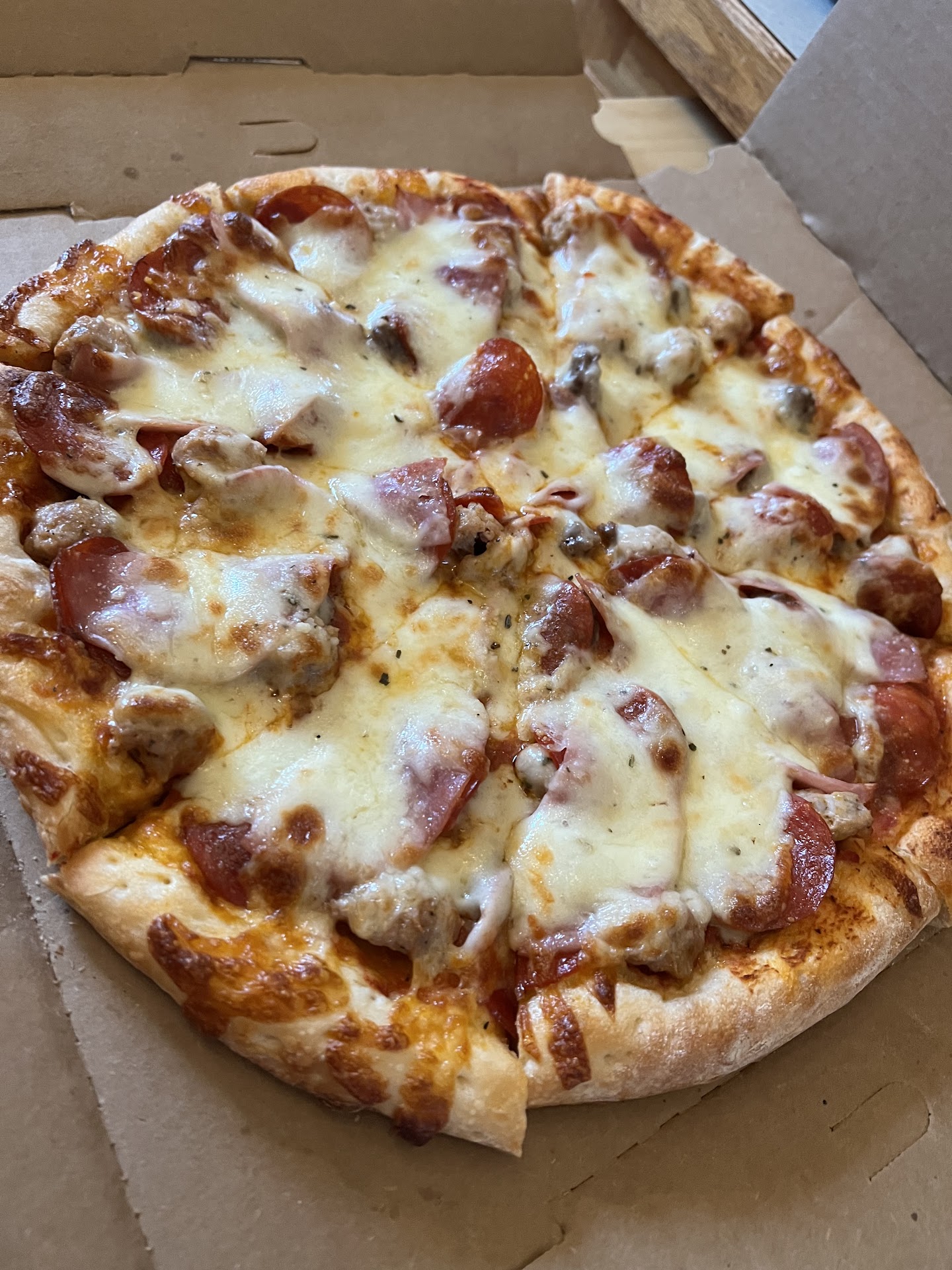 Read moreI called to place an order while we were on the way, there was this horrible fax sound that was destroying my ears. I was put on hold twice. Once for I dunno why and the second for her to figure out what I was talking about when I told her I had the punch card for $10.99 pizzas. I don't like the smell of the pizza oddly enough, it smelled too meaty which I know is weird to say. We got a pepperoni and extra cheese which tasted fine. It was like a cut above dominos or pizza hut, but Pizza pub and a couple other places are better. The prices are also very expensive unless you have a coupon or special deal. We'll probably just order from here once a month with our...