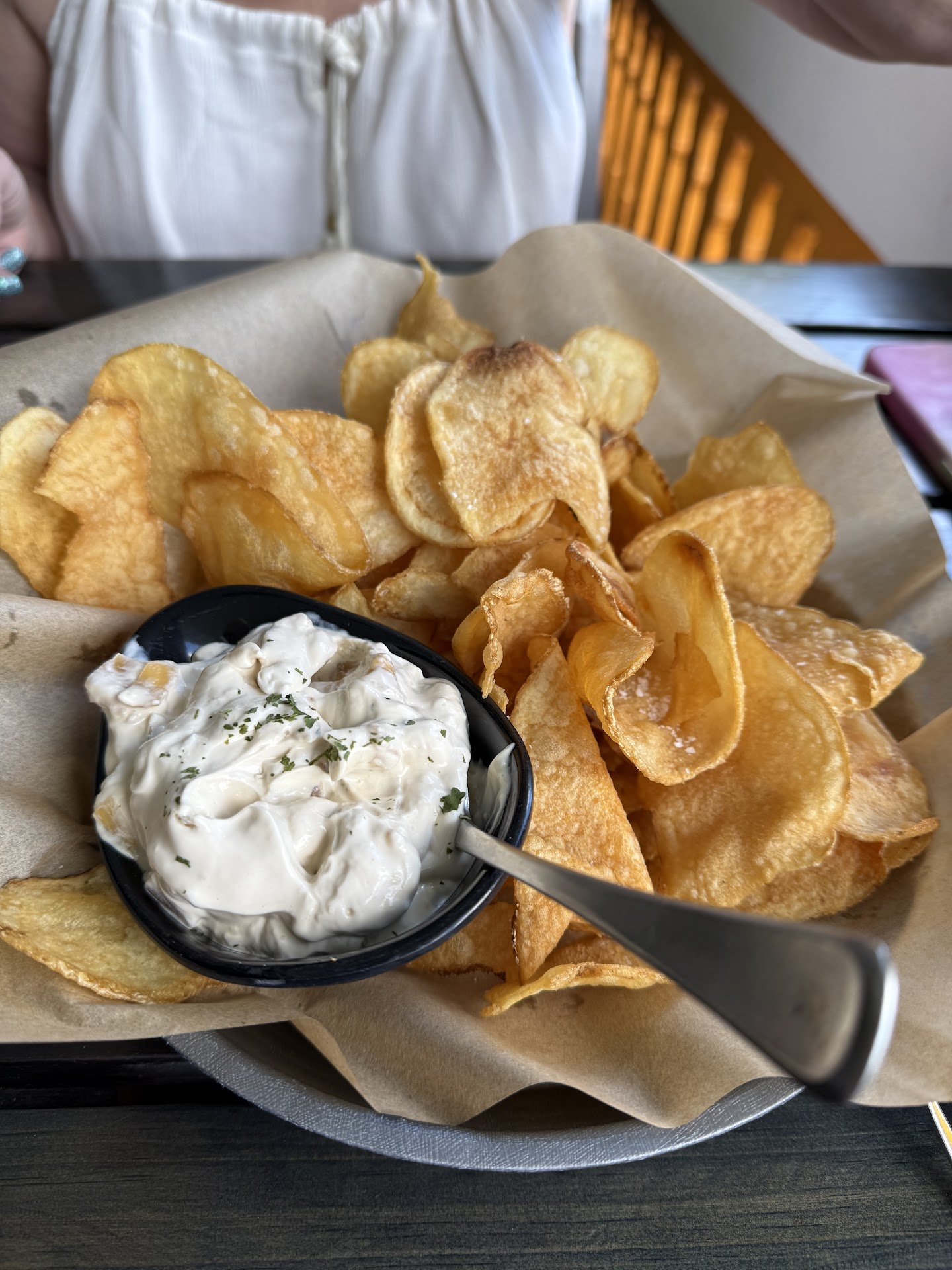The first thing we ate was the house made potato chips with caramelized onion dip. They were so delicious that I could have eaten them all on this first visit, but I’m glad I held back! I had the coconut rice bowl with added avocado. It was beautifully presented, with fresh fruit and vegetables that I came across nowhere else on the island. The entire dish was vegan, including the outstanding peanut dressing. My husband had the fried shrimp and French fries, which were apparently awesome. We had plenty left to take back to our apartment.