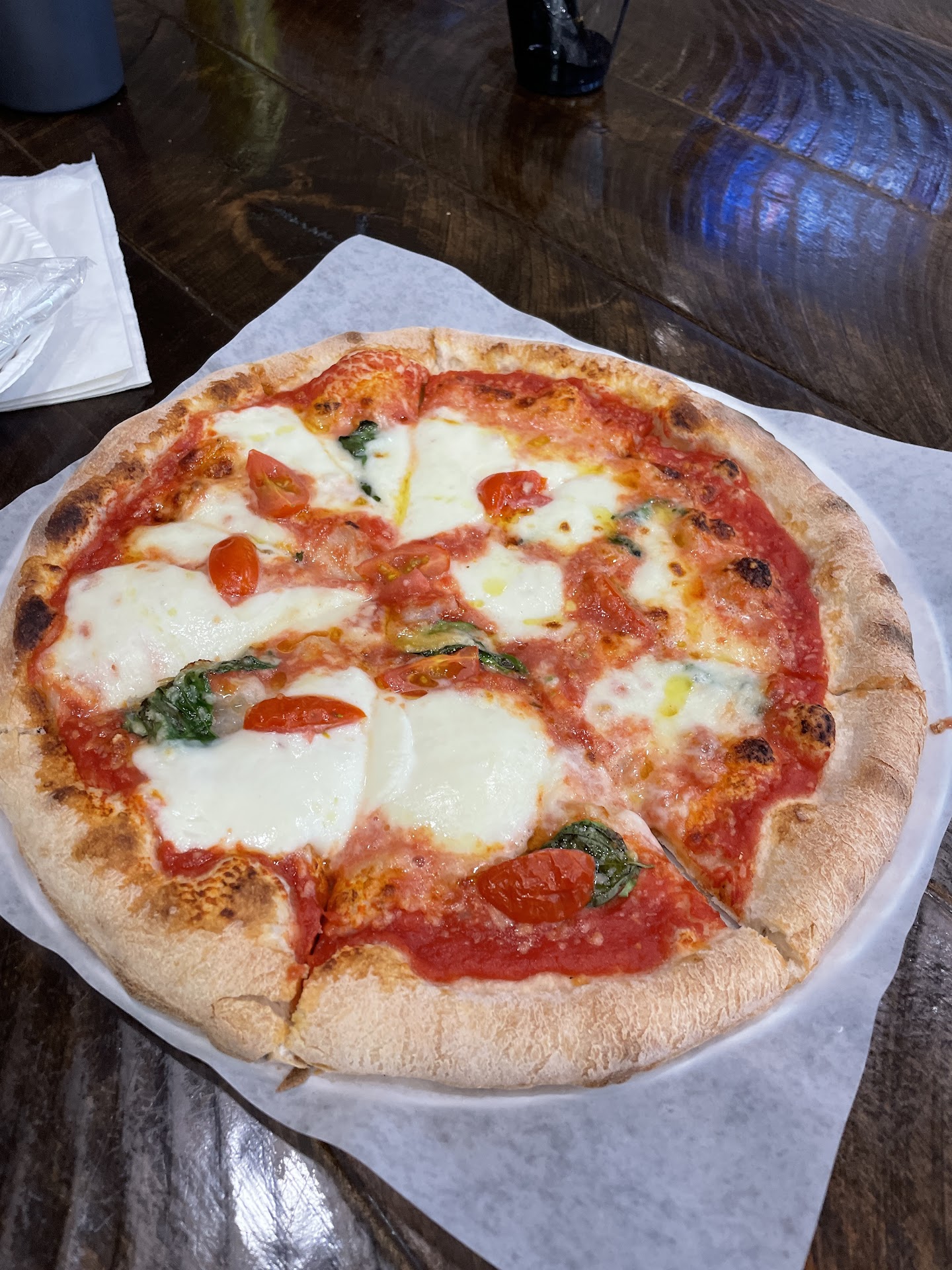 This is a new (opened July 2020) Pizza, Salad, Ice Cream, and Chocolate Shop (Bluebird Chocolates). I decided to order two pizzas. They offer personal pizzas made in a wood burning oven. The skill of the pizza maker was apparent. The pizzas were perfectly done (which takes skill.) The Margherita Pizza was made in a very traditional Italian way (I used to live in Italy) with red sauce, fresh mozzarella, and fresh basil. My only issue with the pizza was the basil was clearly wilted dark green before baking and it should be bright green and very fresh. The crust was absolutely outstanding. Crunchy on the outside and chewy throughout. The sauce was tasty (clearly used quality tomato product). Because it's from a wood burning oven, there is always - ALWAYS - going to be some black char (from flour) on the bottom of the pizza. It wasn't burned but some people don't understand that this is how a pizza made in such an oven comes out. The Pepperoni pizza used a different cheese mix (as it should) and was very tasty although it had a little too much cheese for my taste which makes it little more difficult to eat. And while I found the small pepperoni tasty, I think such an expensive personal pizza ($12.95) could have used a higher quality pepperoni (like the Righteous Slice in Rexburg.) The price is a little high but it's a tourist area - but for us locals it is too high.