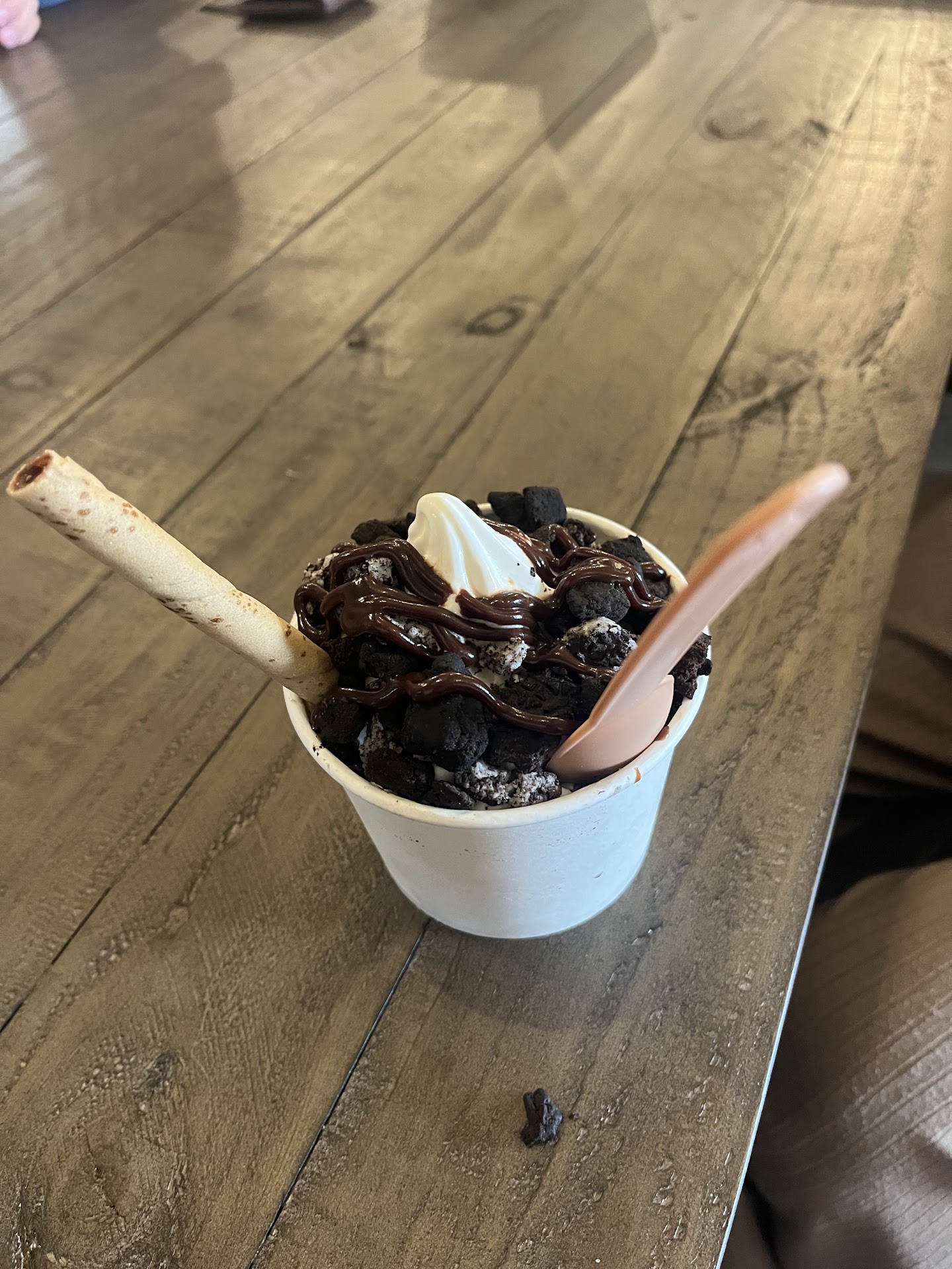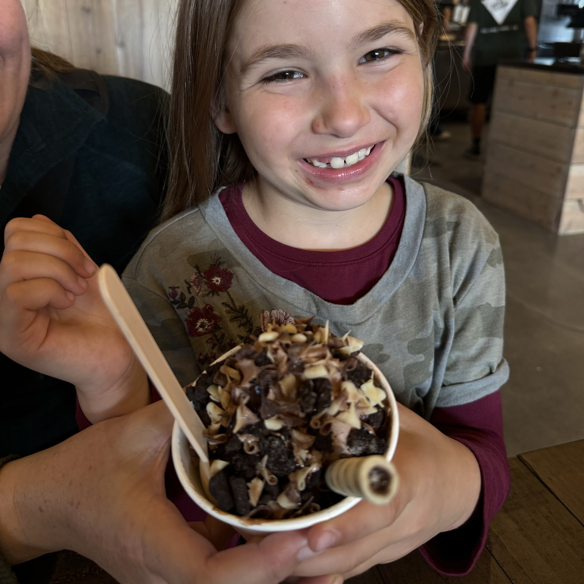 I got the real fruit ice cream (dairy free) coconut ice cream, as a base. Usually wouldn’t go for a dairy free option but after getting a sample I couldn’t not get It! You couldn’t tell the difference between that and the real stuff. I got mine with the fresh huckleberry! I was also able to try that same base with mango and then also with strawberry. They were all very good!! Mango in my opinion was the best out of the 3. My husband got chocolate as a base with strawberry. I will say, the chocolate was rich, so not for me. But my husband loved it so if you like rich chocolate then give It a go! There are a lot of places to sit both inside and out! I had seen that someone had left a review saying the staff wasn’t very friendly but I got the exact opposite. So welcoming, kind and bubbly! I had ordered mine in a cup and last minute decided I wanted a cone which they were so kind to switch for me. 5/5 would recommend and will definitely have to stop every time we go up to our cabin, maybe even multiple times...