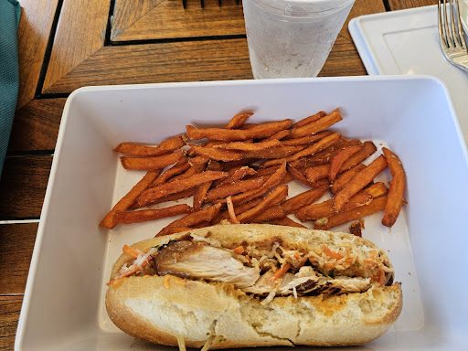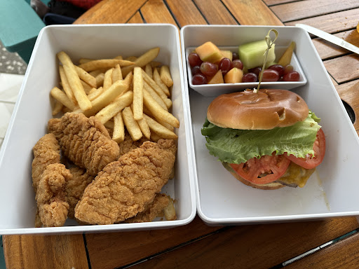 First of all, the food comes in melamine trays with a lid that is genius for carrying them out and keeping everything contained! Coconut shrimp are a nice size and tasty, but watch out for the sauce to dip it in because it’s got quite a zippy kick! They are a kind of bland without something. I am not a fan of corn meal, breaded anything and the strips for the pickles is very different than anything I’ve seen, and even though the breading falls off very easily, between the sauce and the pickles, they are delicious! Chicken tenders were pretty big, but probaby just frozen kind and fries were good. Burger was good and fruit is fresh. Overall, what we ordered for the main meal was pretty standard beach/pool food. Our server, Patrick was very busy, but still on top...