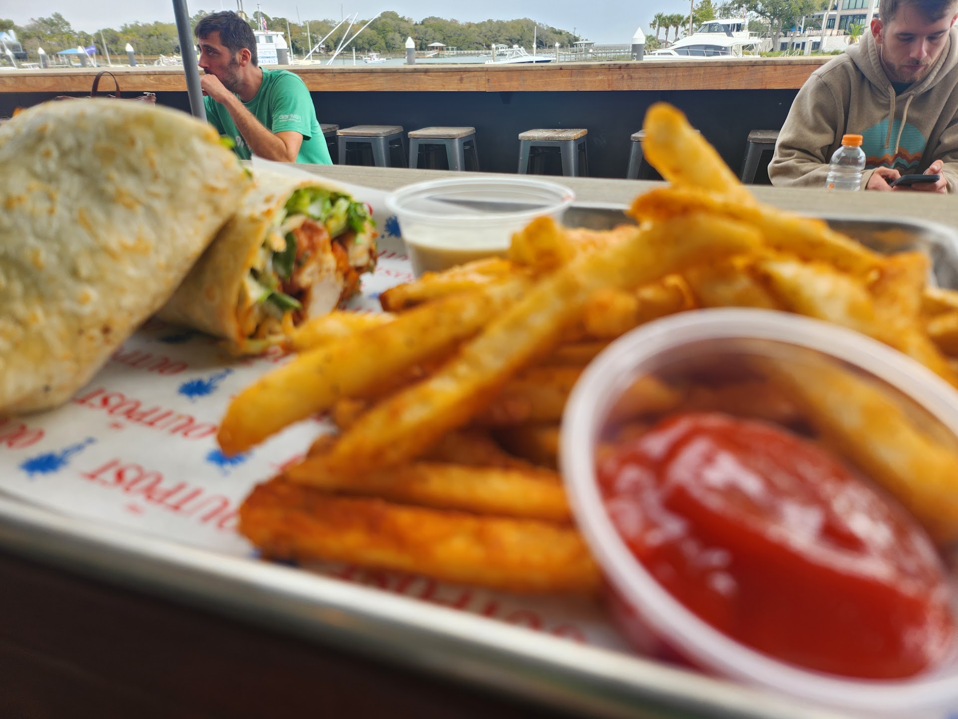 Nestled along the serene Isle of Palms Marina, The Outpost offers a delightful culinary experience that perfectly complements its picturesque waterfront setting. During my recent visit, I had the pleasure of indulging in two of their standout dishes: the Flounder Sandwich and the Buffalo Chicken Wrap.