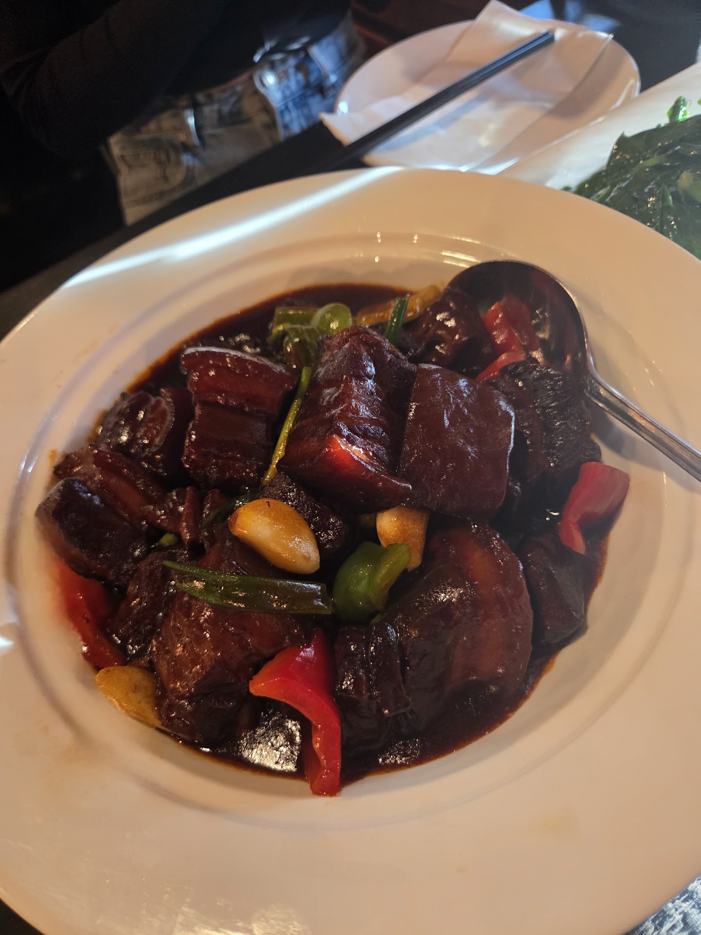 The disappointment was the giant braised pork shoulder from the steamed menu section. The dish came out looking like someone cleaned out the meat off the shoulder and deep fried it, and it looked just like the chilli chicken. I associate a braised item from a steamed section to be a wet dish. I was expecting a slow cooked pork shoulder and not a fried item. The pork was flavorful but chewy. I had the waiter confirm it was the dish I ordered and he did so it’s partially my fault not confirming it was a wet dish.