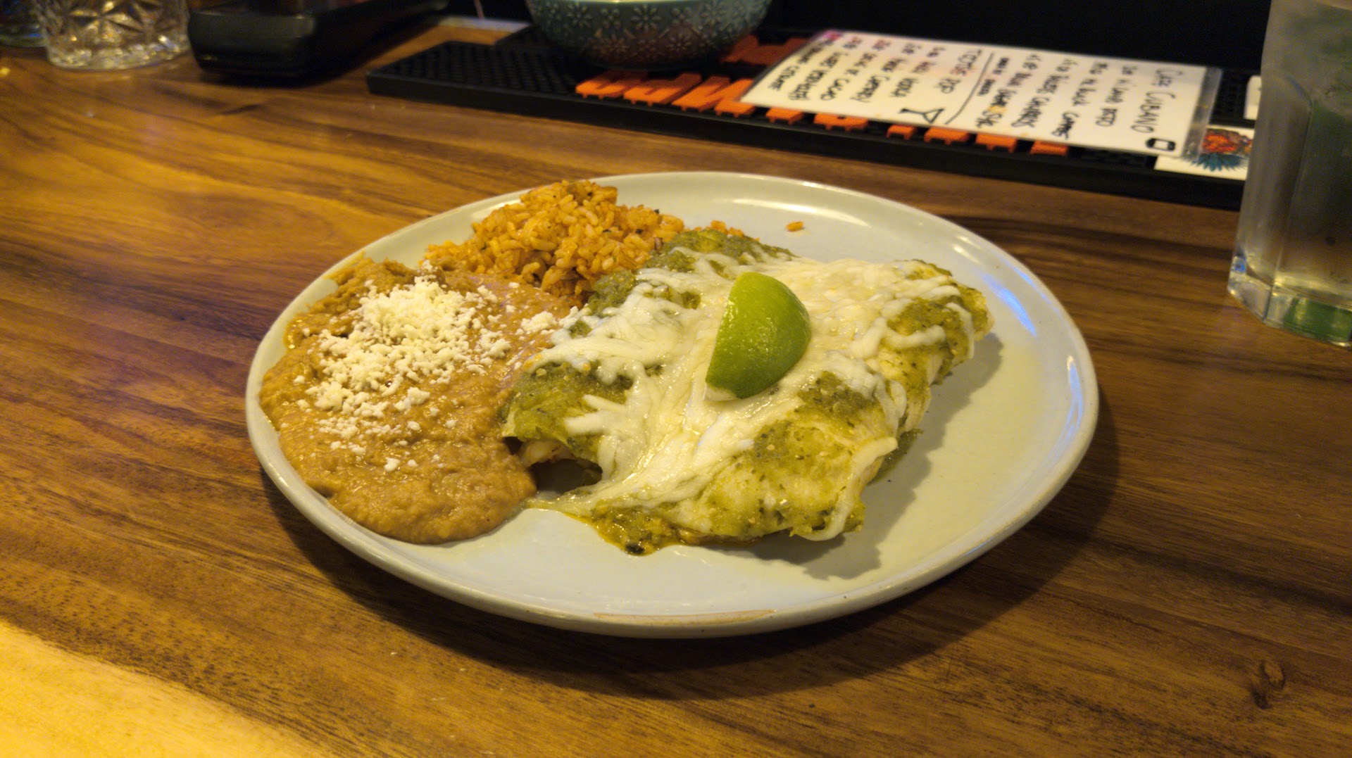 When going to a Mexican restaurant I always try an enchilada or one of their signature dishes. On this visit, I had the enchiladas verdes with lobster and shrimp. The food was plated and served somewhat cold, with the cheese already congealed on top. The server even noted that the enchiladas looked dry and customers that like enchiladas typically order a side of sauce or extra sauce. The dish was served with one large serving of rice and refried beans, and a slice of lime. I was a little surprised that the dish did not have any greens, even a fleck of cilantro nor was salsa offered. I did try two different types of salsas and they were fresh and well prepared. I had a tempranillo that was undrinkable though. I did arrive shortly before closing, suspect the food will be better at brunch or earlier in the evening. I rarely leave negative reviews, but this one was worth noting. I will try this restaurant one more time at brunch or earlier in the day before making a the...