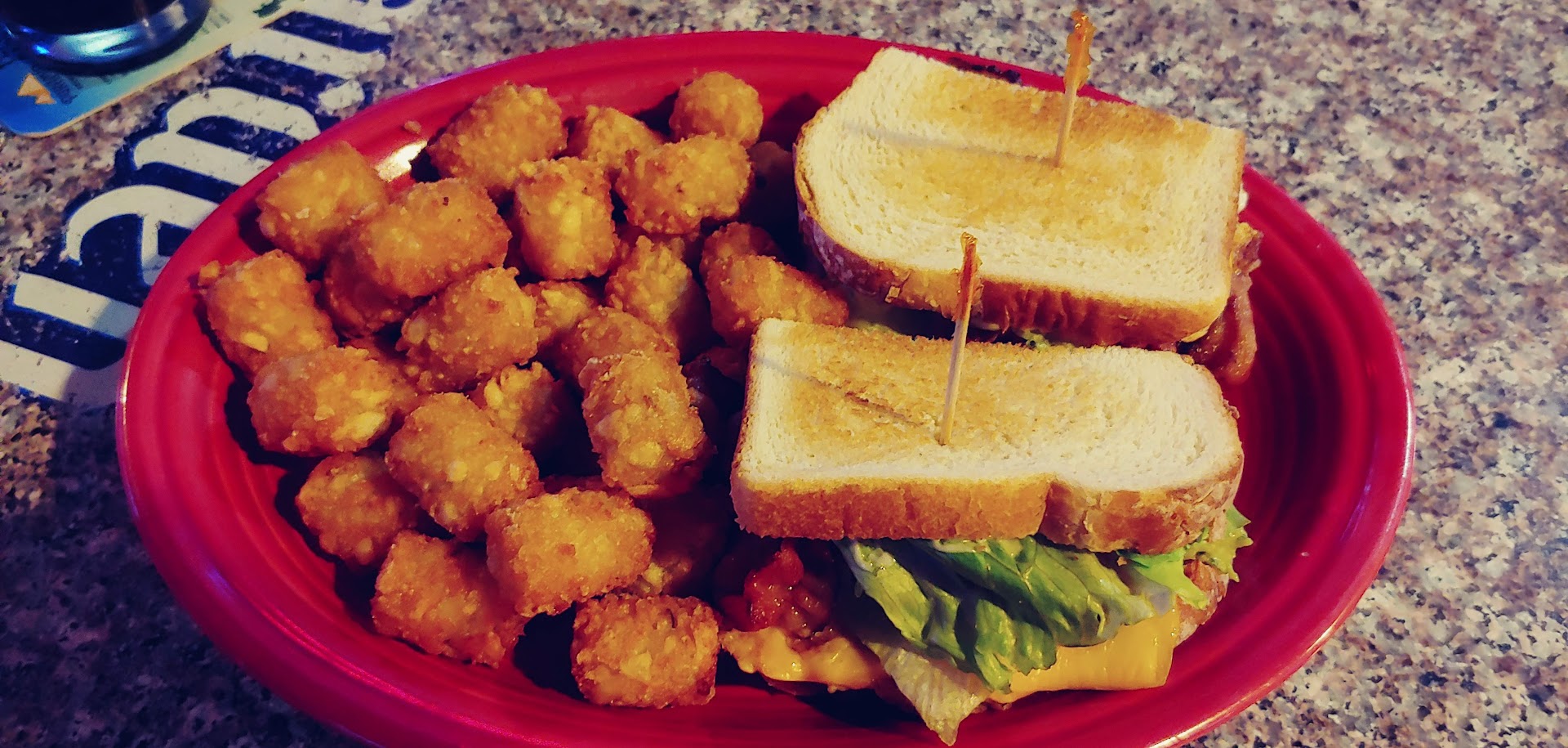 Taste: B.L.T.C.E= The Bacon, Lettuce, tomato egg and cheese Sandwich. I added guacamole to it because they didn't have just avocado and even then the waitresses suggestion was good and as a cook i could tell it would taste good on the sandwich. It was most definitely good. plenty of bacon and the egg and cheese gave it a nice little bundle of flavor to it. it was a nice over easy egg and melted cheese in it. The egg yolk provided a nice creaminess that when tasted with the guacamole and the crunchiness of the bacon was just right. it was a medium sandwich that wasn't too heavy or too light. I have no gallbladder so it was perfect and good for my stomach. lol The flavor was consistent in each bite. The tater tots were crispy and not greasy and very hot and very good.