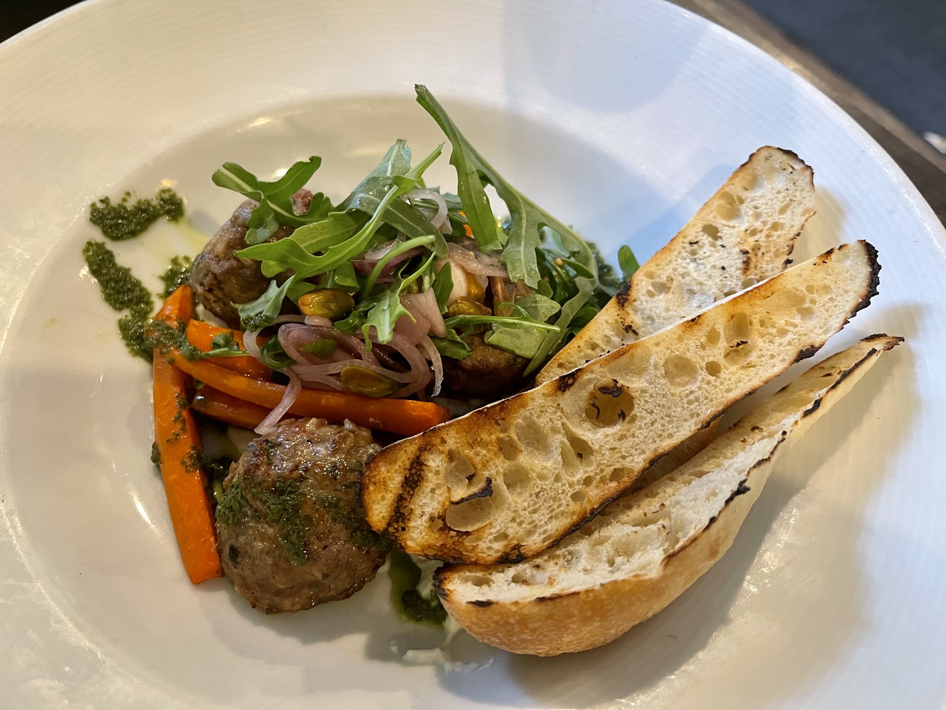 My Lamb meatball entree $22 was a bit smaller (3 small meatballs) than some other entrees but super flavorful. The ricotta sauce base with mint pesto sauce on top was delicious. It was sprinkled with a few pistachios and served with slivers of grilled carrot and pickled onions. Yum! However, I did ask for a piece of grilled sourdough on the side to make it more substantial. I wiped my plate clean as it was so tasty.