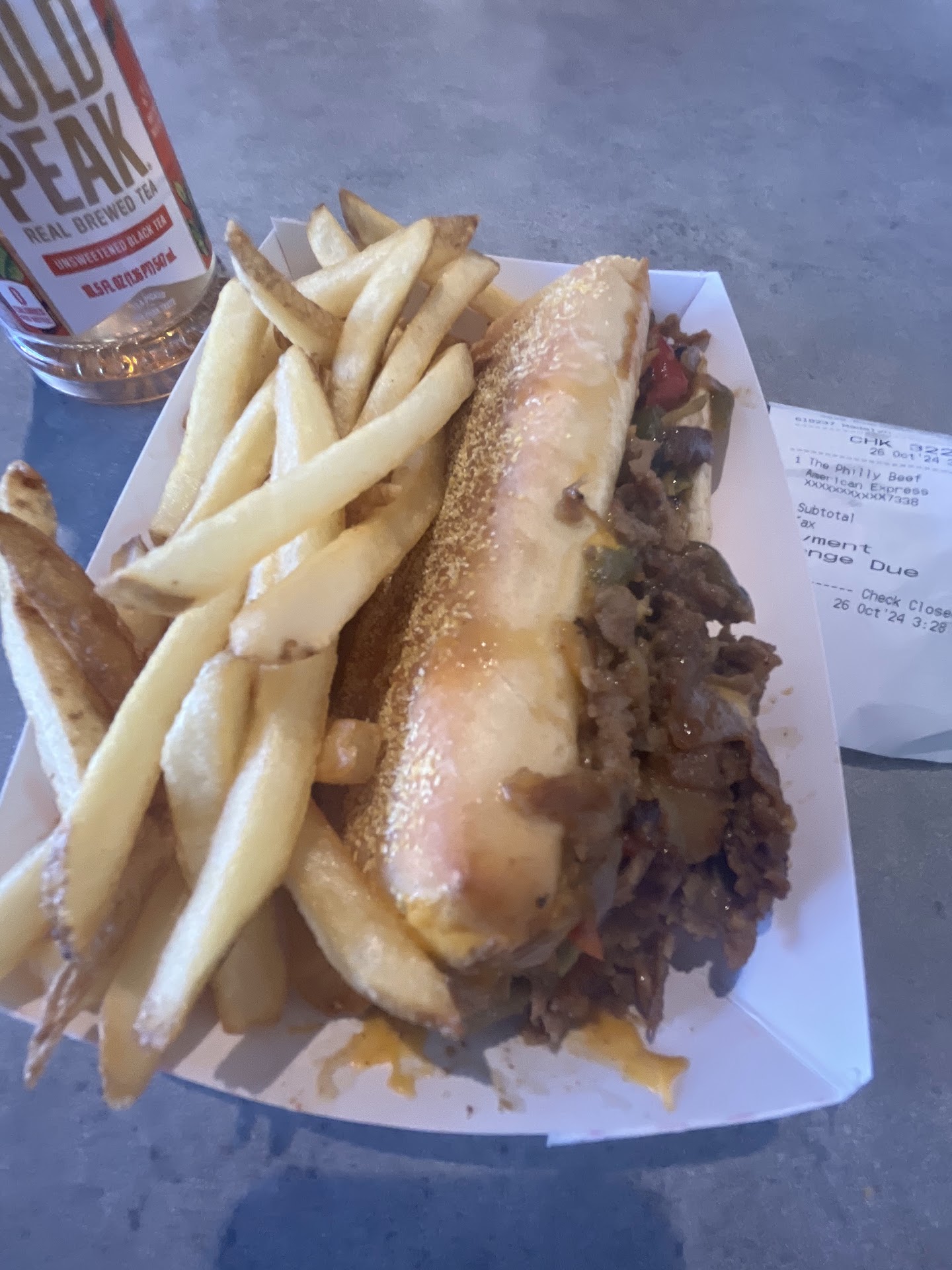 The cheesesteak was a stale bun with some bland chicken scooped in. It was topped with the most neon, plasticky nacho cheese I’ve ever seen in my life. It was absolutely revolting. The cheese had an artificial and repulsive taste to it.