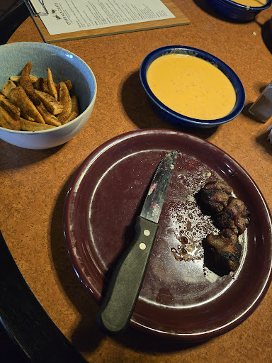 The server was nice and filled all our requests. But at times, tone sounded irritated, and seemed annoyed if too many things were asked for at once. The item we waited longest for was highly requested grilled shrimp, and would only come out 5 skewers at a time. Refills were small, plenty for two people... not eight. The lobster bisque came out in small, disposable, black ramekins. Literally three spoonfuls. When I asked for another, the server stated he'd brought out a bunch and everyone should have received one. Sir. May I have more than a sip?? It's delicious... bring me six or seven! When it was time for dessert, another server brought requested cheesecake. I told her we'd need another slice (a sliver honestly) for my dad (birthday boy), who was in the bathroom. She stated she'd "already brought four."