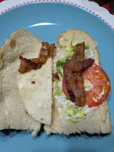 (I keep a cooler in my car, and his sandwich rode home in the cooler, which, without ice in it, also keeps warm things warm. That's a "pro-tip" for grocery shopping too, btw.)