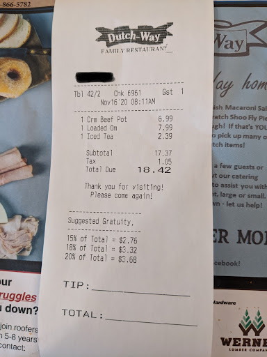 Read moreWe received a gift card to Dutchway as a gift for Christmas. We have never been to the restaurant so we thought it would be nice to go out as a family and get dinner. My husband got a patty melt, I got the buffet, my daughter got pot pie, my oldest son a chicken sandwich and my youngest got chicken tenders. Our food was brought in a timely manner but my husband patty melt was literally just bread and a burger patty. No onion, no cheese, no sauce. The piece of chicken on my son’s sandwich took up only half of the bun. Our waitress was a young girl who was frantically running around trying to do her job. We noticed the manager and other staff did not offer help once. We sat for at least 20 minutes after we ate our food waiting for someone to come over. I eventually took my kids to the car and my husband complained about our food and service. Our waitress was amazing and did the best she could, but to see her run around and struggle like that was unfair. It seemed like every time we tried to ask for assistance we were ignored. They did not charge us for the patty melt or chicken sandwich.