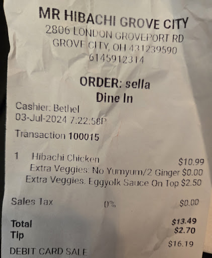 Read moreMy new favorite Hibachi place in Columbus. I have visited Mr. Hibachi twice in the last two weeks and it has been amazing both times. They really put a lot of preparation and effort in their dishes. Unlike some other Hibachi places Mr. Hibachi’s food is packed with flavor. Additionally the portions are huge and prices are very affordable. I was quite surprised to see lobster tails on the menu. Topped with my favorite egg yolk sauce makes a wonderful meal! The employees are really helpful and polite. I truly felt welcomed and that is somewhat rare in today’s standards.