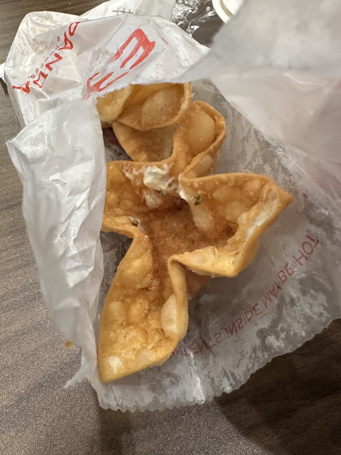 Now the crab Rangoon if you can even call it thatwas another slap in the face. Three tiny pieces, barely filled, and the one that actually had anything inside tasted like expired mayonnaise. Iâm honestly not sure what I ate, but I regret every bite