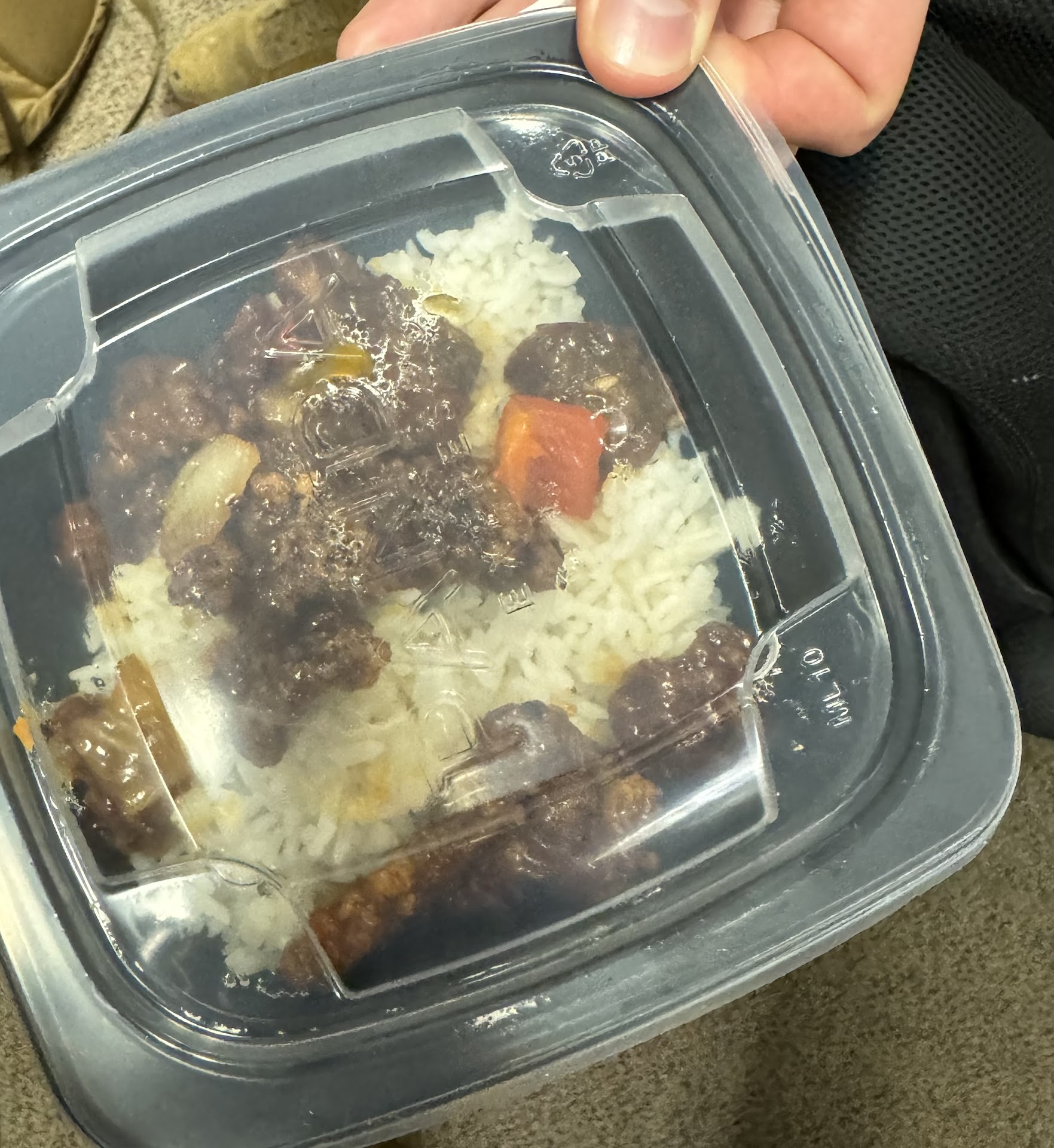 The container they gave me? Was bigger than the portion of rice I received. Iâm Hispanic, and I can tell how old rice is just by tasting it. This rice was incredibly dry, and the grains were short and hard. It honestly tasted like the mystery rice they used to serve in middle school cafeterias. It looked and tasted like they just threw some plain white rice in a bowl and mixed in some veggiesâthere was nothing fried about it. I wouldnât be surprised if it was two-day-old rice left out on the counter without a cover.