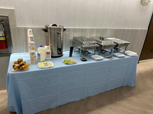 The waiters came early to begin setup - subsequent to a massive rainstorm that took place the night before where there was major flooding throughout the streets the morning after. I, myself, had been hindered in reaching the venue because of the flooded streets and roadblocks in the area, and yet somehow when I finally arrived I was shocked to find that the hall was almost finished being set up. By the time I came down to begin the celebratory meal, laid out before my eyes was the sight of an exquisite presentation, each table topped with light blue tablecloths and loaded with fresh bagels and literally boards of spreads and toppings that were both visual and palate pleasers. Let's not forget the buffet stations of scrambled eggs, hash browns and pancakes that were all super delicious. The food came in ample amounts, and with the knowledge that everyone loves to take home food from a Bris, they provided their own custom-made, sturdy "to-go" bags rather than the typical more flimsy foil sheets that you would expect to find at an average Bris. Cereal and chocolate milk for the kids together with donuts and pastries galore. Orange juice and iced coffee provided in their own clear and compact capsule containers so the guests can keep their attention on the important stuff instead of distracting themselves with the ingredients on the conventional bulky containers you'd buy at the supermarket yourself. All of my guests came back to me with a "wowed" reaction, raving about how impressed they were with what an outstanding job Rosemary performed. Notice the flower centerpiece they provided on each table as well that added an elegant touch to enhance the party. No need to dread about the clean up and worry about getting on the hall's nerves - Rosemary got us covered on that too. They left the entire place spic and span exactly how it was the night before.