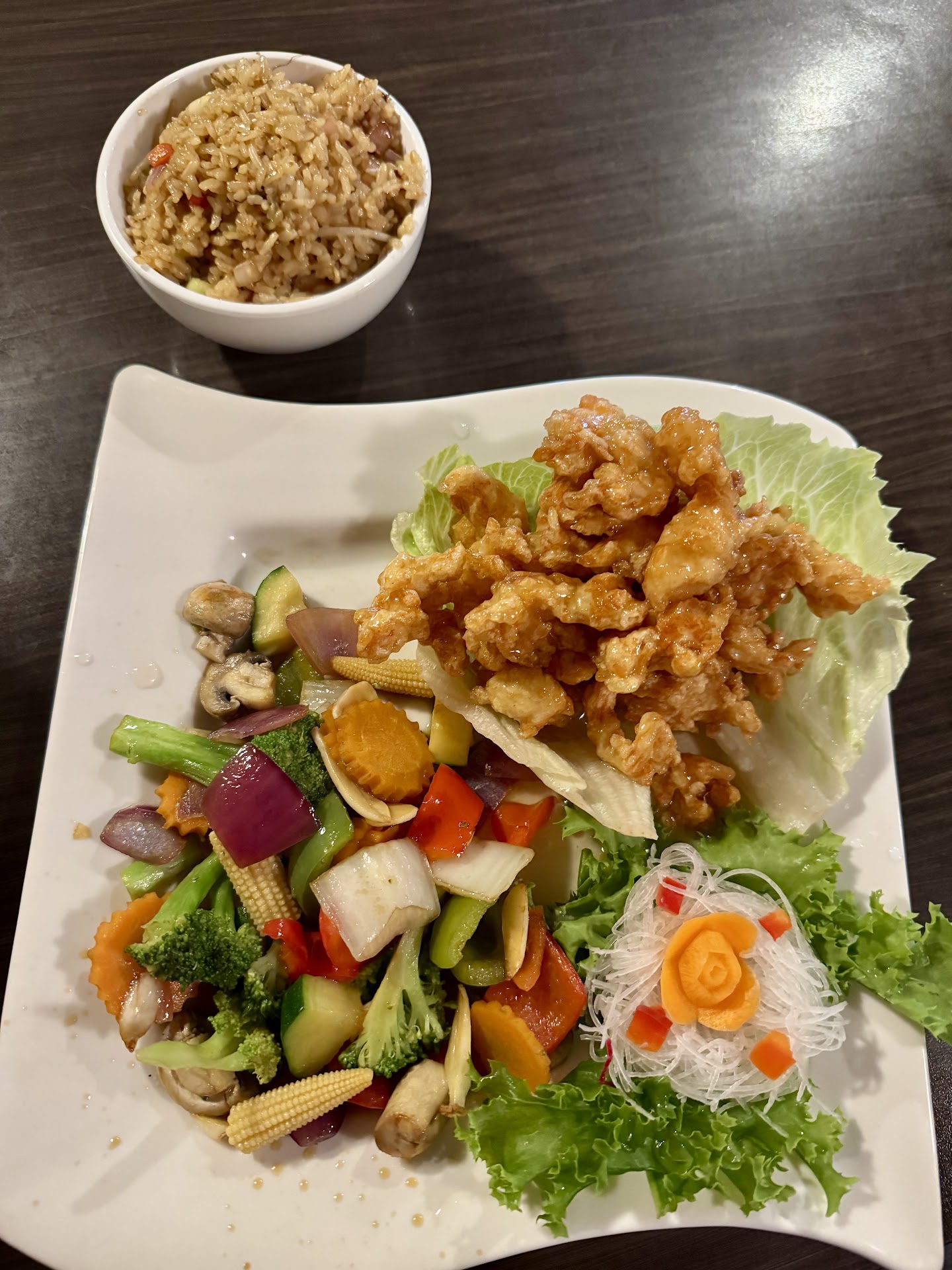 I started out with the lemon grass salad that come with my meal, it was simple but the flavor was so refreshing! Next we had my appetizer, I ordered the Veg. Vietnamese Spring Rolls that came with a plum dipping sauce. I'd never had a plum sauce before and it was very good and had an unique flavor. For me the best part of the meal was my CRISPY Honey chicken and basil fried rice (it's so hard to find GF crispy chicken so this was so satisfying for me, I do wish they offered the crispy chicken with more options)