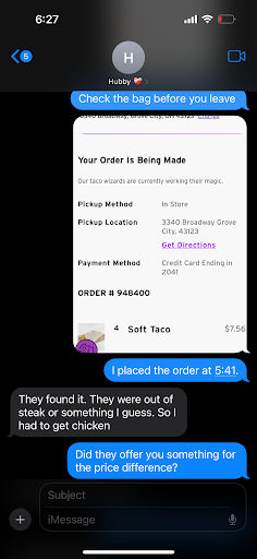 Read moreOverall horrible experience. Tonight on 1/21/25 I ordered for pickup. Our order was suppose to only take 5-8 minutes per what web said, order was placed at 5:41. Hubby showed up to pickup our food at 5:56, they claimed no order was placed. Eventually they found our order and stated oh we are out of steak thatâs why it wasnât started so hubby substituted his cheesy dipped burritos with chicken. 40 minutes is how long it took to get our food. 10 items, 40 MINUTES. He took bag out to car to check over and they forgot an order of dipped burritos. Once he got home beyond flustered we realized they didnât give us our chipotle sauce for the dipped burritos and my cantina chicken crispy taco. Feeling defeated we just ate our dry tiny burritos instead of going back to raise hell. I previously managed in food for 5+ years, I understand mistakes happen but this is just ridiculous. Hubby stated they were staffed and drive through orders were flying out the window however our experience was a...