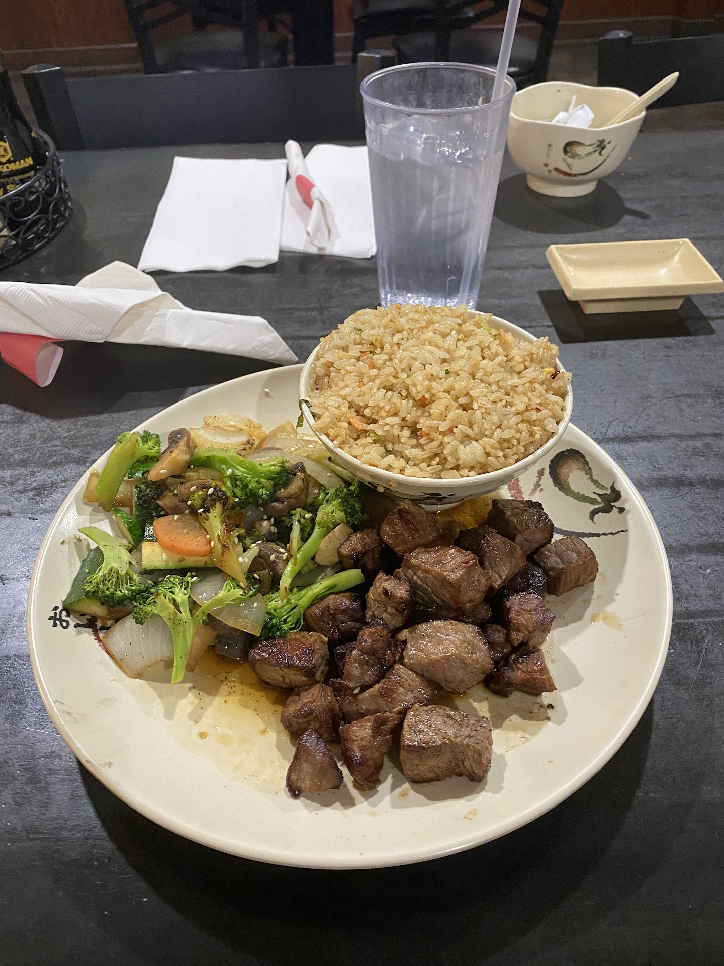 Ok we will start where it began me and my wife made a reservation on google for 530 and wearrive at the restraunt for the host at the door to inform us that google reservations isnt working right for them so we are gonna have to wait 30 mintutes well we decided to wait well they end up seating us with 8 other people around a very small hibachi flat top nobody could move without bumping someone else our server brought everyone their soup and salad we will begin with the soup the soup was basically beef both that had been salted to the point that it tasted like sea water with two tiny slivers of mushroom and green onion i dont think anyone finished it the salad was soupy where they cleaned the vegetables but didnt dry them the dressing was a ginger dressing but was very gritty me and my wife also ordered sushi with our meals i ordered the Philadelphia roll and her the california roll her sushi wouldnt stay together at all and mine they put advacado in it instead of cucumber for some reason and the advacado was brown and mushy instead of green Now on to the main meal the steak was a little underseasoned but over all it was good juicy and tender the shrimp was very flavorful and juicy the rice was basic fried rice but good and the vegetables we grilled but not overcooked and had alot of flavor