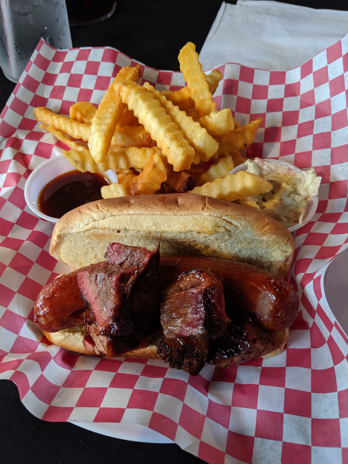 Where do I start... I wasn't going to rate this place to begin with, because I don't often want to waste time on average restaurants. BUT! Your establishment made me and my family sick to our stomach LITERALLY! And no we ate nothing else prior that day to blame so we came hungry. My husband had to miss work the next day. Now, for the culprit that made us sick, I'm not sure since most of the food was warmed up or not freshly made. The waiter said " Our ribs were made fresh today." I guess I should've took that as a warning and not shrugged it off. So before you say I don't know BBQ, yes I do Sir! I'm from Houston, Tx and we get down! We have an annual rodeo with bbq competitions and the works. We don't need to slather our bbq with sauce, it drips juices and fat all on it's own. I do appreciate your sauce, It was a great flavor and much needed since most of your meat was dry. Your chicken did not taste fresh and was dry, same for your brisket. They were average and did indeed need sauce. Your freshly made ribs were indeed overcooked and fell off the bone probably from them sitting in your smoker for so long since it was towards your closing time at 5:30 I believe. Your sides were decent, the mac n cheese was disappointing. Noodles were a bit gummy still and cheese was lacking the "cheese" it needed. The onion rings were fried fresh but not so sure about the batter since they were kinda rubbery after the initial crunch. Your "giant" potato was not so giant. Portions, Atmosphere, Service was OK. The wait to be served was way too long for everyone there conisdering your establishment was empty. Everything was again average and nothing to write home about. I know the owner most likely will reply, so let me say this. I wish in no way to tear down a small business it seems you try to work hard for, but honestly a restaurant that is not busy and booming on a "holiday" needs improvements. I understand times are tough, but making customers sick and eat food that was not freshly prepared is unacceptable. Being open to critique is critical for success. I hope you fix your problems and your doors remain open because you have good bbq flavor but need...