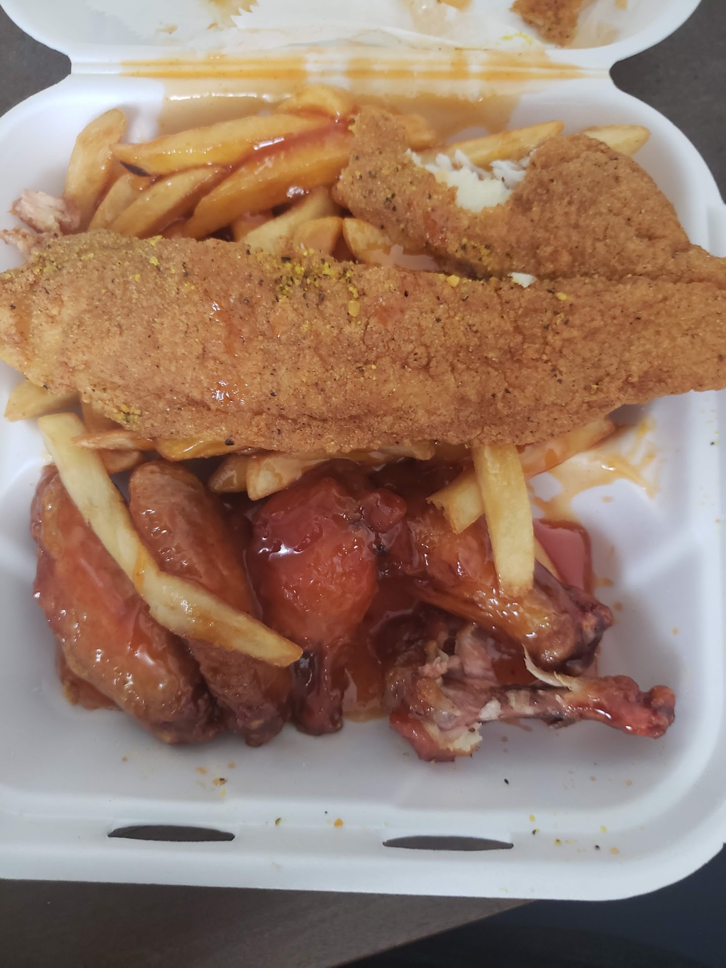 As if that wasn't enough, I also indulged in their Catfish and Hot Wings combo meal. The catfish was tender, flaky, and cooked to perfection. Paired with the already amazing hot wings, it was a seafood lover's...