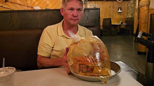 I couldn’t finish my entire meal so I asked for a large to-go container. I was told that the restaurant didn’t stock any. Instead it was suggested that I somehow pour everything remaining on my large serving tray back into the original plastic bag to take home with me. This was clearly going to be impossible for me to do, so I requested TWO small styrofoam containers, which my waiter kindly provided for me to fill by hand.