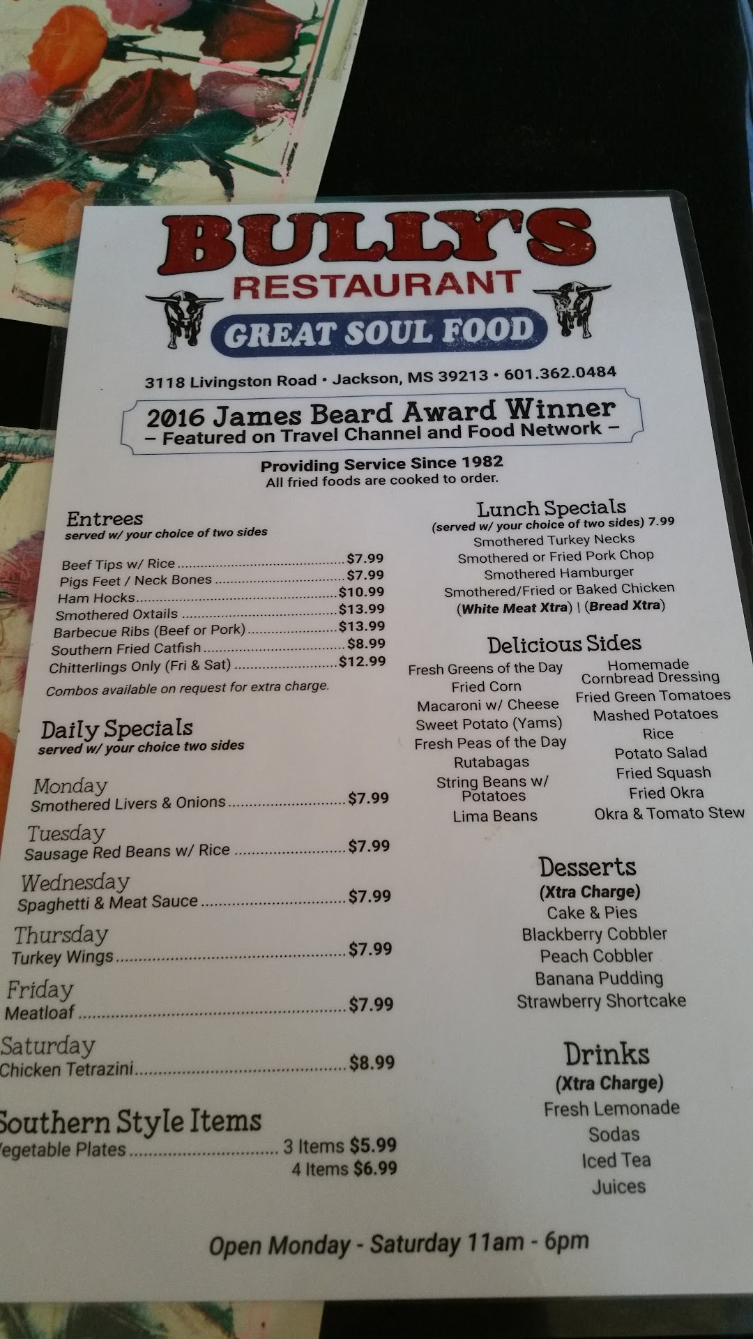 Read moreI have the most disappointing experience at this establishment. I am visiting town from Dallas, Texas, and the place was recommended by the the Marriott Westin hotel downtown. I took a few photographs in the establishment just because I was excited about the culture and was really thrilled about having some southern vegetables. A Jackson Mississippi police officer came to my table and asked me if I took photographs. I told him that I had taken some photographs, and if he appeared in any of my photographs, I will be happy to delete him. the officer was very rude and I finally asked him if he owned the establishment. That he did. I told him that he should post notices if no photographs are allowed, however, after reviewing reviews, there are many photographs of this establishment already posted. As an African-American male, I have realized that other African-American males treat each other poorly. Since the only establishment, I told him that I would not be eating there, left a $20 tip for the waiter, and left the establishment. After the encounter a Marshall, who was also eating there, came outside and talk to me. He asked me what the other officer said to me, and I told him he tried to get me to go back into this establishment. However, he ruined the experience. if he truly owns the restaurant, I don’t recommend this place to any out-of-town guest. I will also be notifying the Westin downtown that they should not recommend this establishment to any out-of-town guest as they might not be welcomed. I cannot rate their food as I would not eat at a establishment that I’m not welcome. I am unable to service poor excellent. How if the officer is the owner it is a really pathetic situation.I will post my pictures so hopefully the owner sees that his face is not in my pictures. He certainly is...