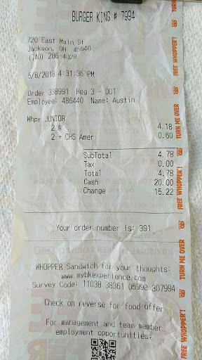 Read moreIt sucked...they didn't even know what I was talking about when I tried to order their new Bbq bacon Swiss burger thats being advertised on tv and finally sol me a Jr whopper with Swiss and bacon and added bbq sauce of which cost me over $17 for one large meal 1 6pc chicken nugget kids meal and 2 ice teas when my order was 2 of the meals which was supposed to include the drinks and one kids meal. I had to go back for a 2nd sandwich because I was trying to take my daughter and grand daughter out to eat before the fireworks so I didn't get to see the fireworks AND it cost me another $4.09 for just another sandwich which if that's the actual price of their "new" sandwich it is NOT worth it. I WILL NOT be wasting my time or money at BK in Jackson, Ohio ever again and seriously advise others of the same if they want good service for a...