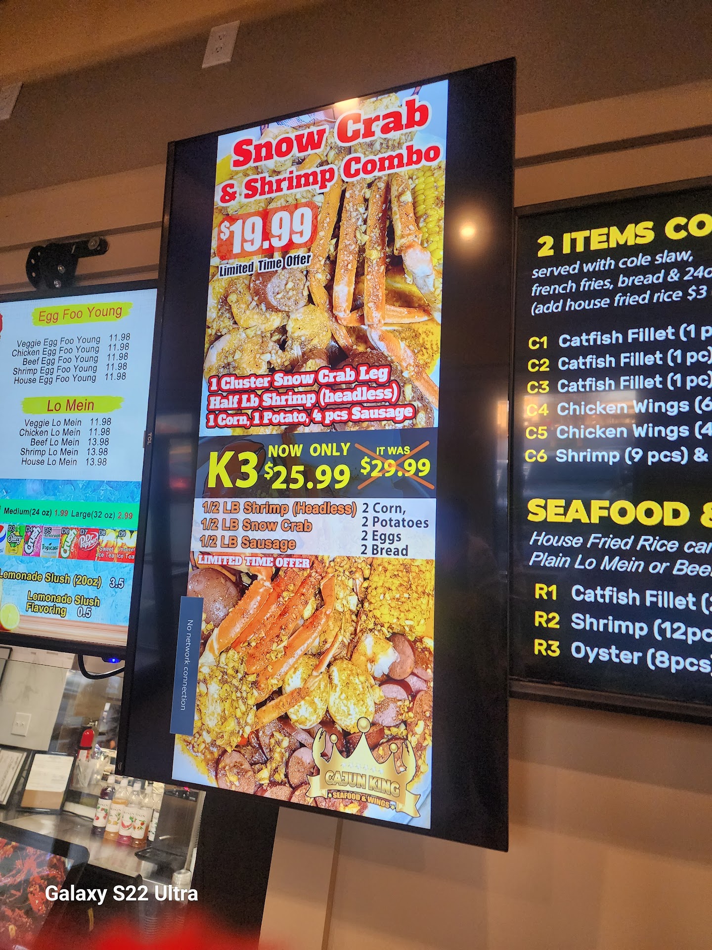 Read more2 people $130. Food came out fast, hot and order was correct. Catfish was fire, best I've had in a while. Breaded shrimp, needed more time cooking. A bit undercooked on the breading but edible. Fries were terrible and under seasoned. Sausage came in a bag with corn on the cob and an egg. Way to much Cajun seasoning in the bag. Sausage was edible after wiping some sauce off. Egg was good and the corn was the best part of my meal. Hands down the best corn on the cob to touch my lips, ever. Only had 1 unfortunately but it made the meal. My wife, Alaskan crab, king crab in a bag with corn and egg. She had 2 complaints, to much seasoning and only 1 corn 🌽. Was it worth the price, no. Will we be back, yes. For more corn and crab legs. Cashier did her job. Food again came out fast. They are hold on tight to their best product with...