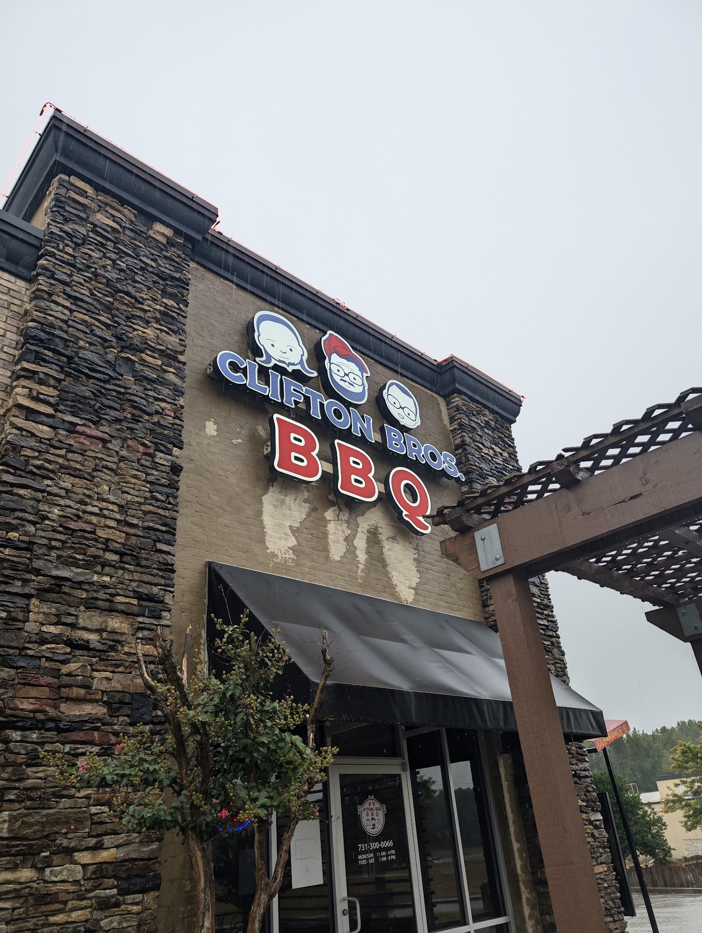 Read moreDriving through Jackson, TN heading back home and wife and kids wanted BBQ. We pulled into Clifton Bros and man are we happy we tried this place out. The BBQ Nachos are top tier, the pulled pork on them were full of flavor and the portion could have fed the entire table. The ribs were amazing as well, perfectly tender and sauced. Even the potato salad was superior to many other I've had as well as the beans. Oh!! We cannot forget the chorizo queso that was perfect!! The staff were very friendly and food came out quickly. The lady at the register was so sweet and we found out she was from Texas too. Their was a gentleman that gave my two boys a chocolate chip cookie that was fresh and so good! I can't wait to return to try some of their other meats. This place deserves to...