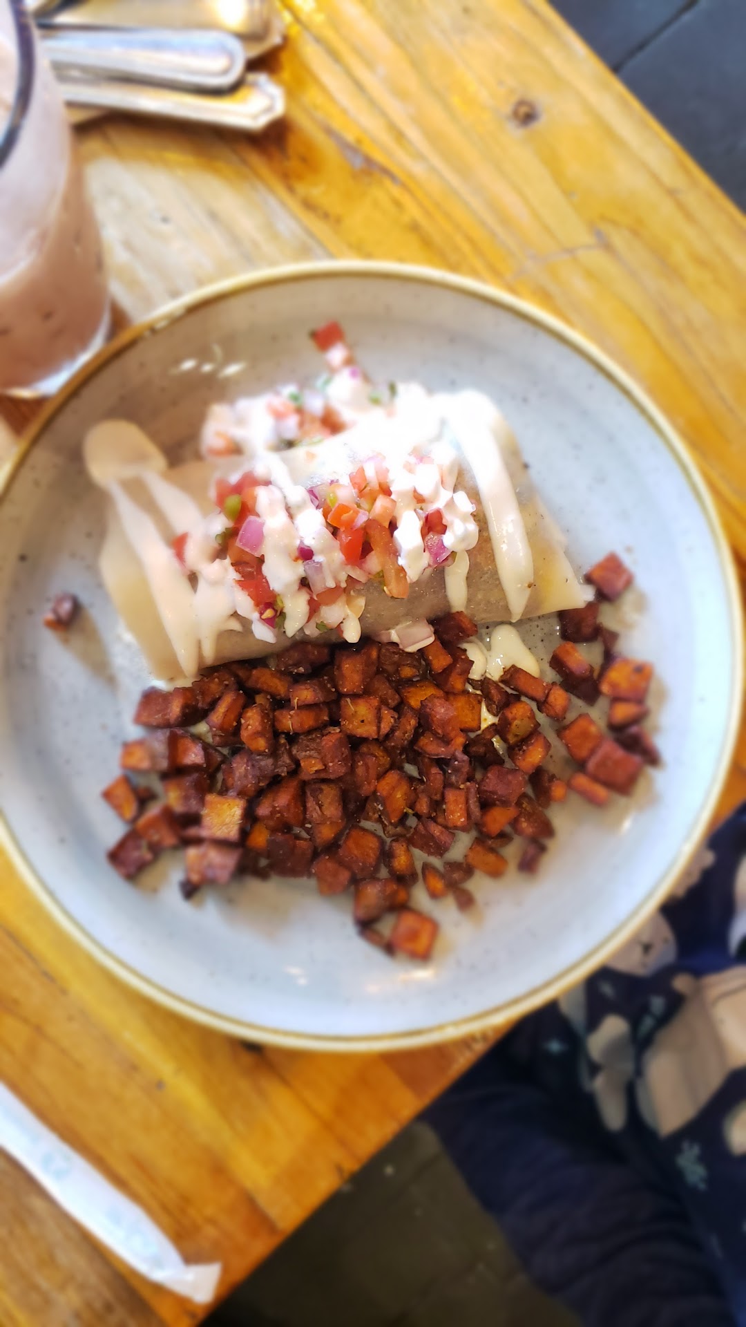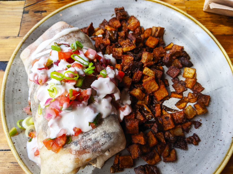 We ordered the chicken and waffles, breakfast burrito, coffee and chocolate milk (many different milks available from cow, cashew, almond, etc).