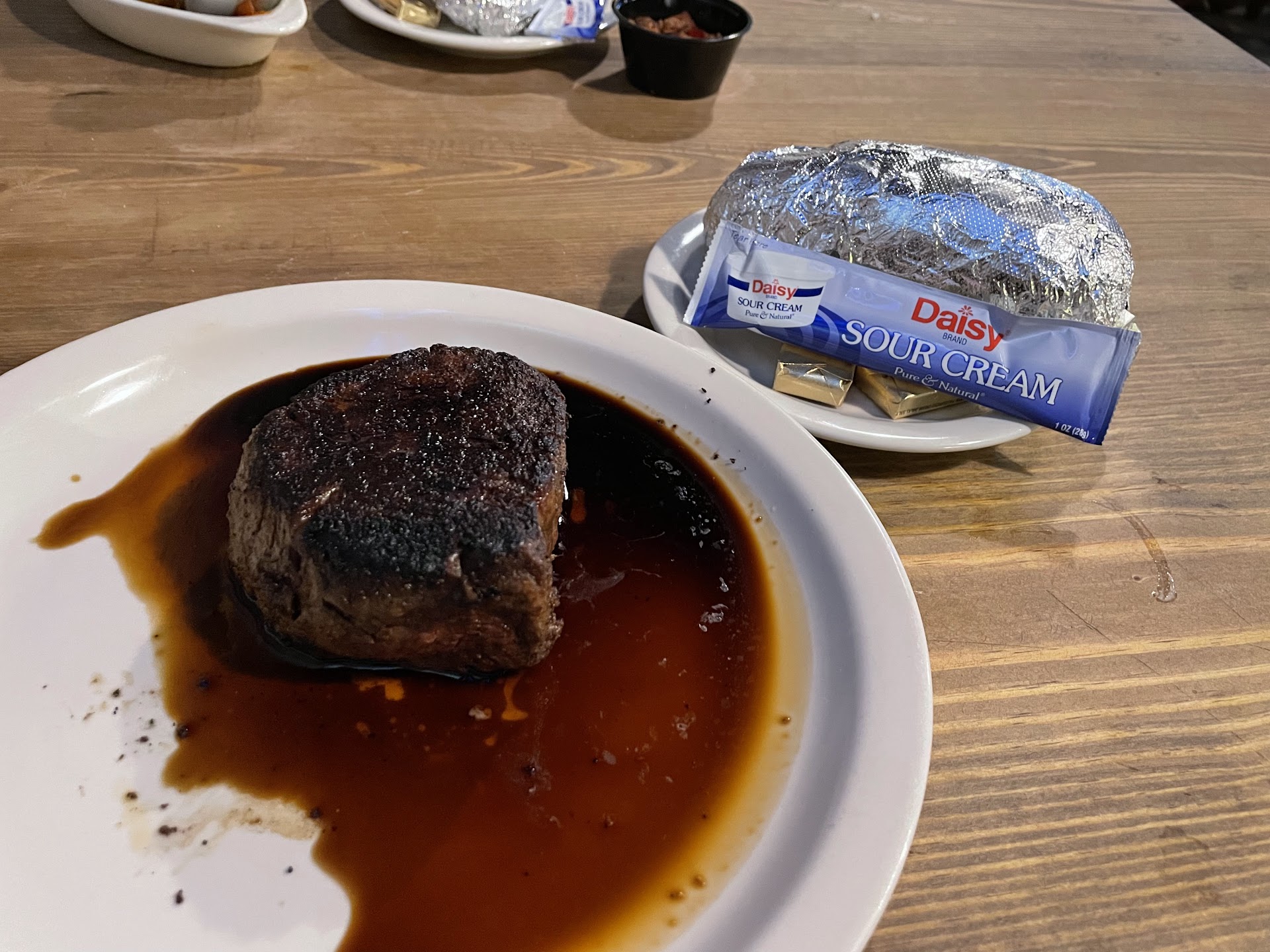 Read moreThis was a hard three stars. The steak alone, I’d give an easy four - five if it was priced ~$12 less. This place has great potential however, there were several areas that fall short. 1. The bases of the tables have absolutely no business being in a restaurant. The bases are big, round, and they hurt when you slam your knee against them several times through dinner. Beware and stay cautious. 2. The food presentation is lacking. Your dinner and side items are served on two different plates or trays. Baked potato is too large for a small side plate. 3. Speaking of baked potatoes, very strange for a high-priced restaurant to provide sour cream in a packet and use low grade bulk shredded cheese. 4. The dining on the bar side is very loud with a modest number of people I’d suggest sound dampening materials for the walls and tablecloths. 5. The side salad that comes with your dinner is laughable at best. Chemical tasting lettuce out of a bag with tomatoes and croutons. 5. The meal was supposed to come with bread for the table - ours didn’t.