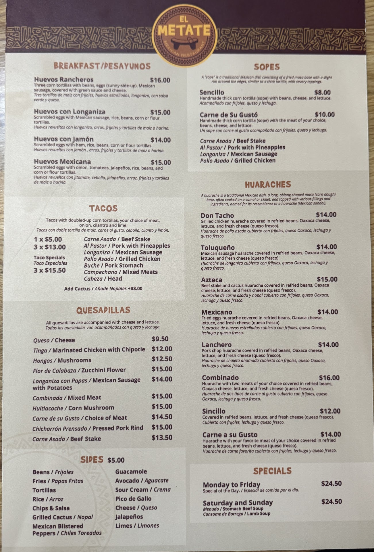 The service is top-notch, with friendly and attentive staff who are happy to guide you through the menu. And what a menu it is! From classic tacos and quesadillas to more adventurous options like taquitos and carne asada, there's something for everyone at El Metate.