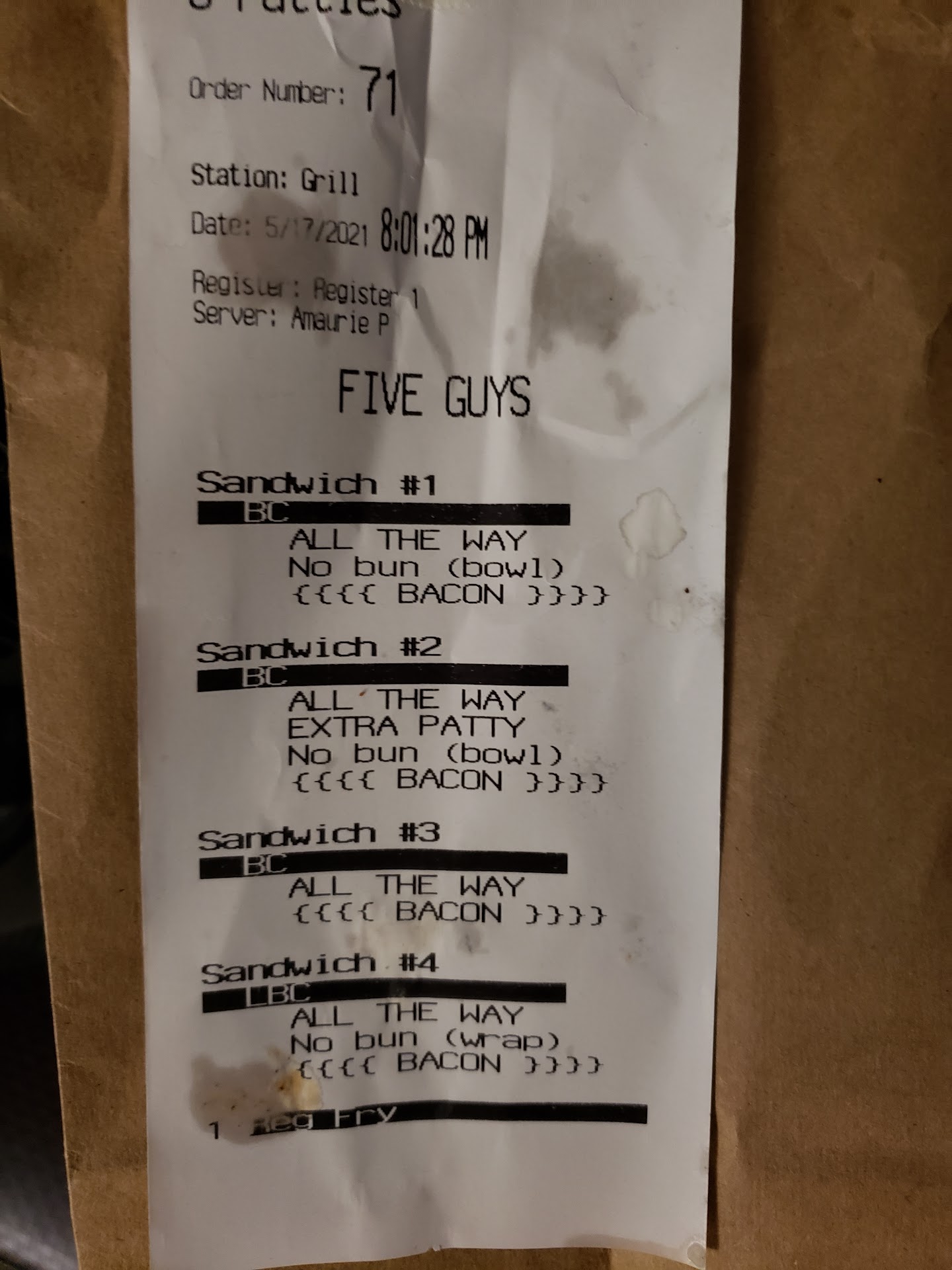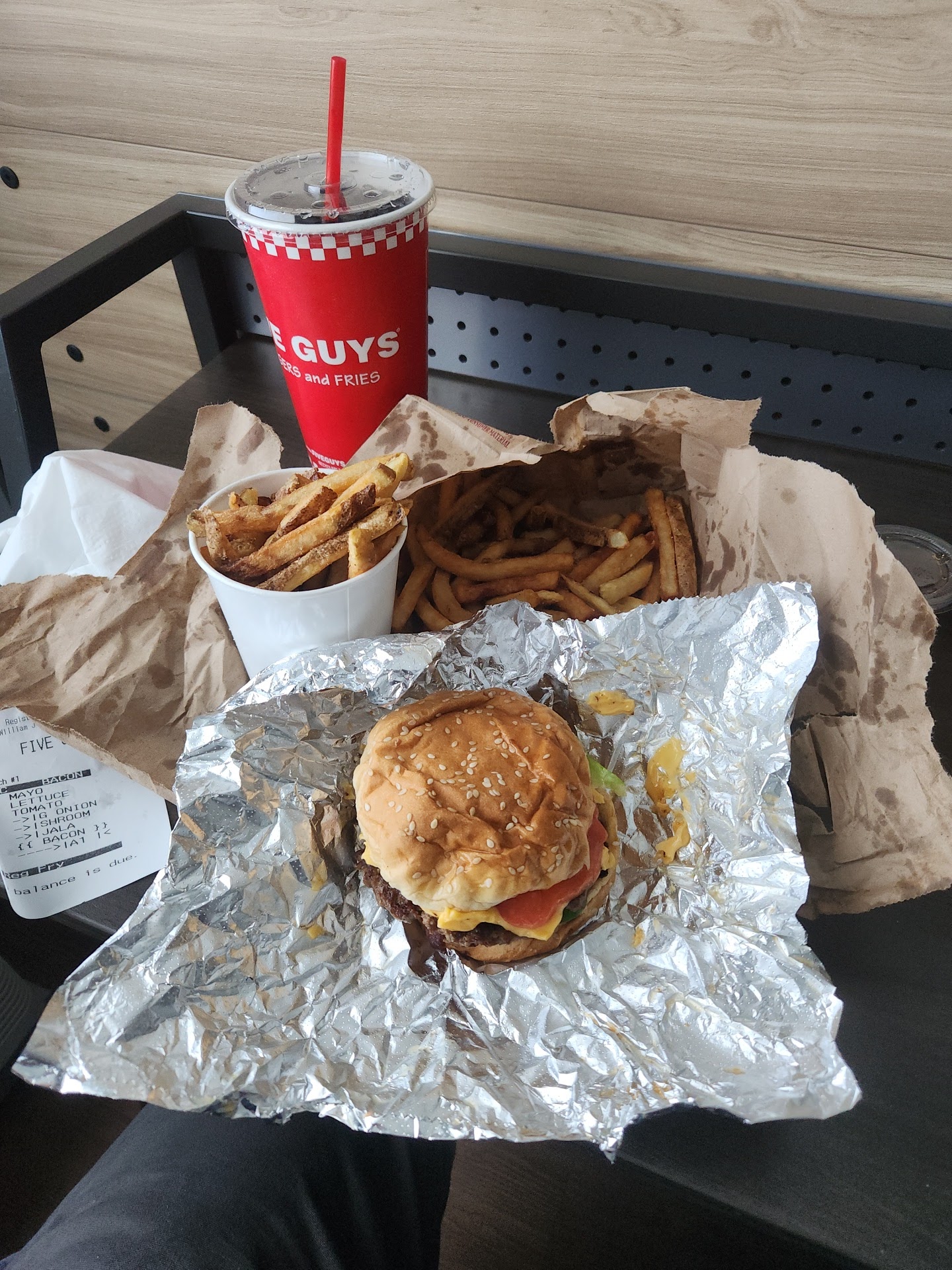Read moreUnsanitary. Employees with enormous stringy weaves without hair nets. Weave swinging around the food. Employees haven't changed their gloves in the 25 minutes I've been waiting for my food. Touching doors, wiping covered hands on their aprons, leaning with gloved hand on prep tables handling pens, repeatedly and unnecessarily touching the same burger and bun wrapping and unwrapping and re wrapping the same burger and taking things away and adding other things to it. A complete cluster. Another employee who was the only one who did change his gloves, when he did, sweat poured out of his gloves onto the floor in front of where I was waiting, then went and did NOT wash his hands. Instead of using soap and water to clean his hands, he went to the sink and got some paper towels and just wiped at the sweat. And then struggled to put new gloves on his sweaty hands. The is food all over the floor and they are just walking on it. They are walking around in circles staring at the orders and each other clueless. After 30 minutes, when I finally received my food, I threw it in the trash and walked out. I will never come here again. The health department needs to inspect this place on the evening shift. 5 guys corporate needs to inspect this place and fire the...